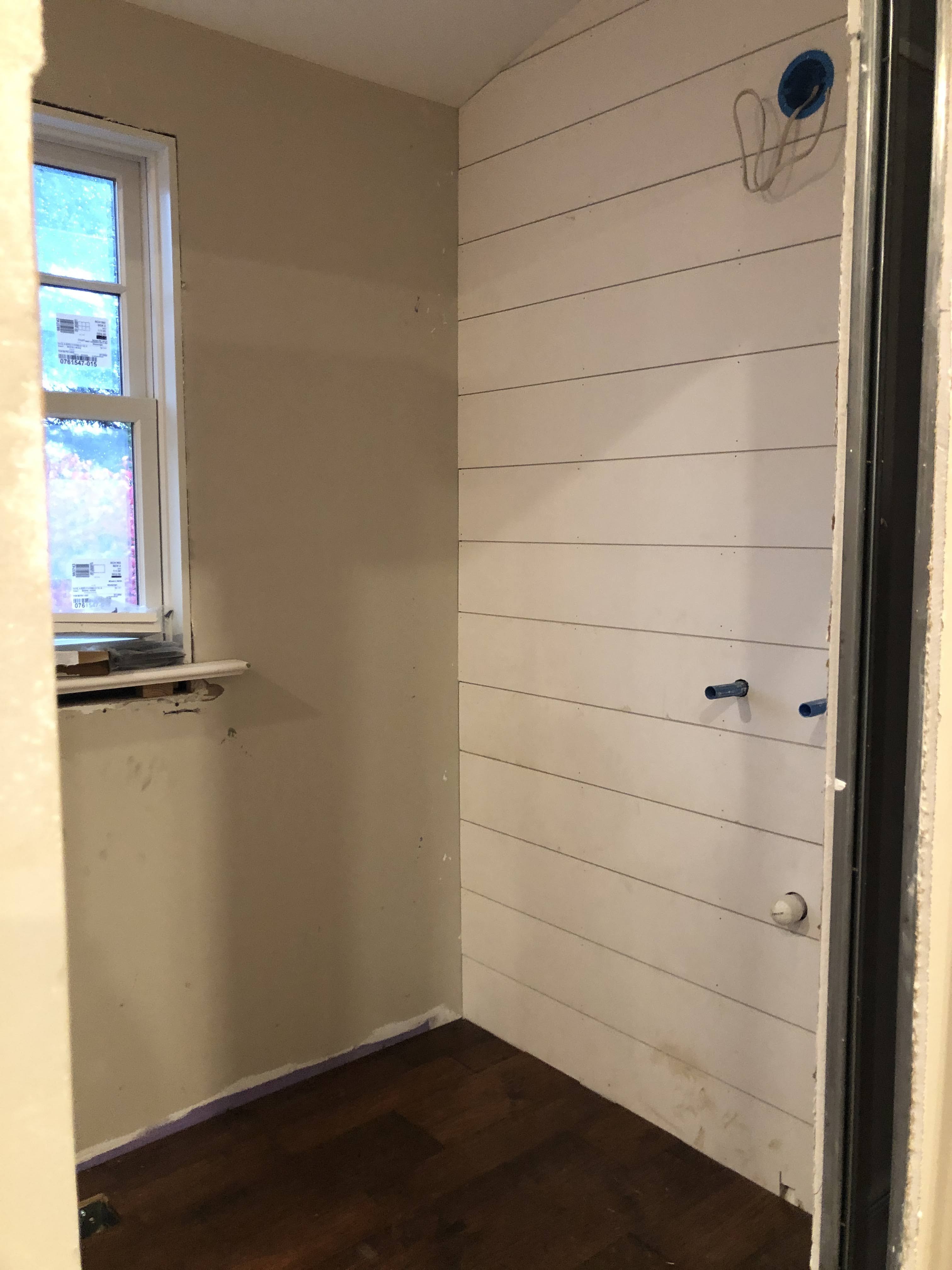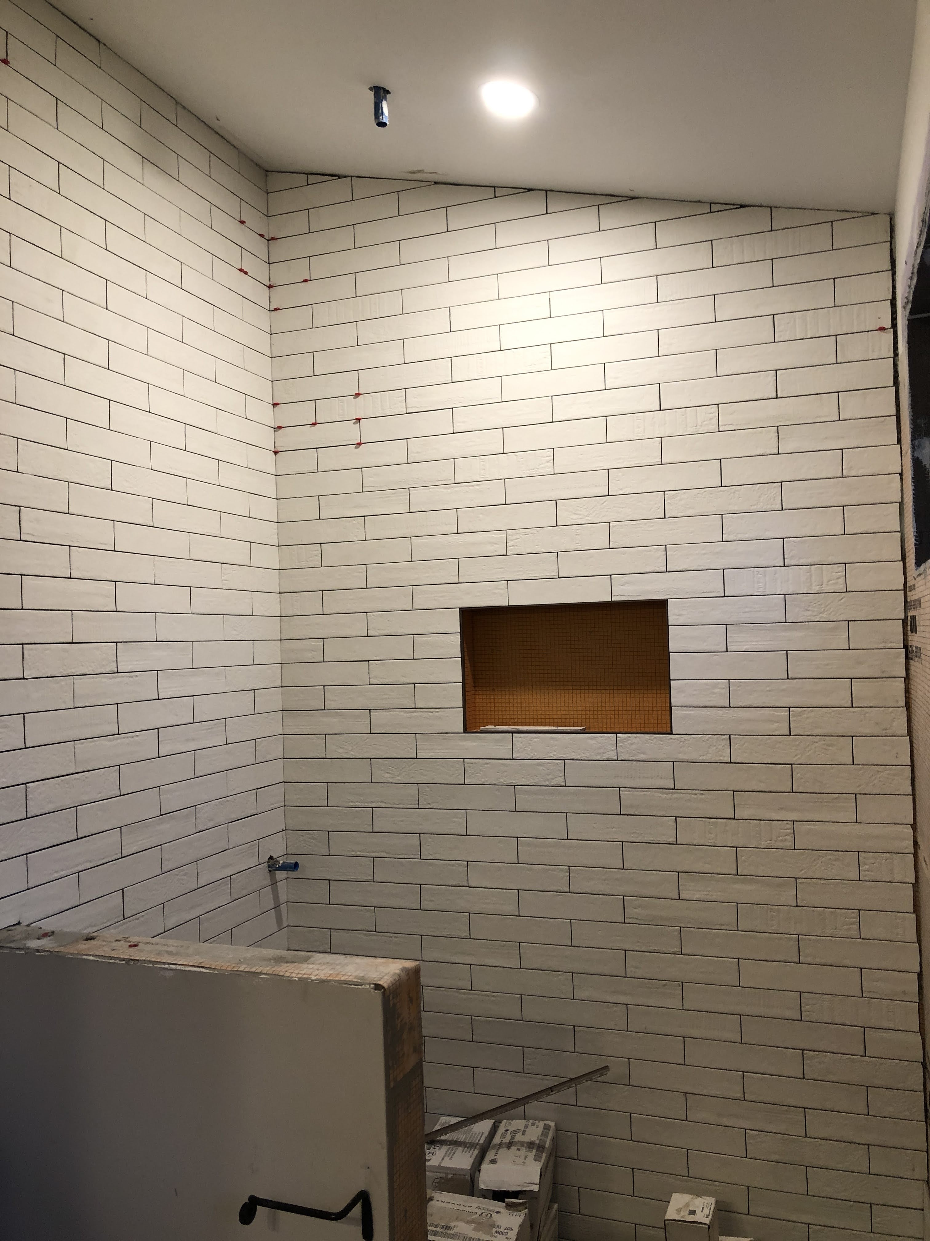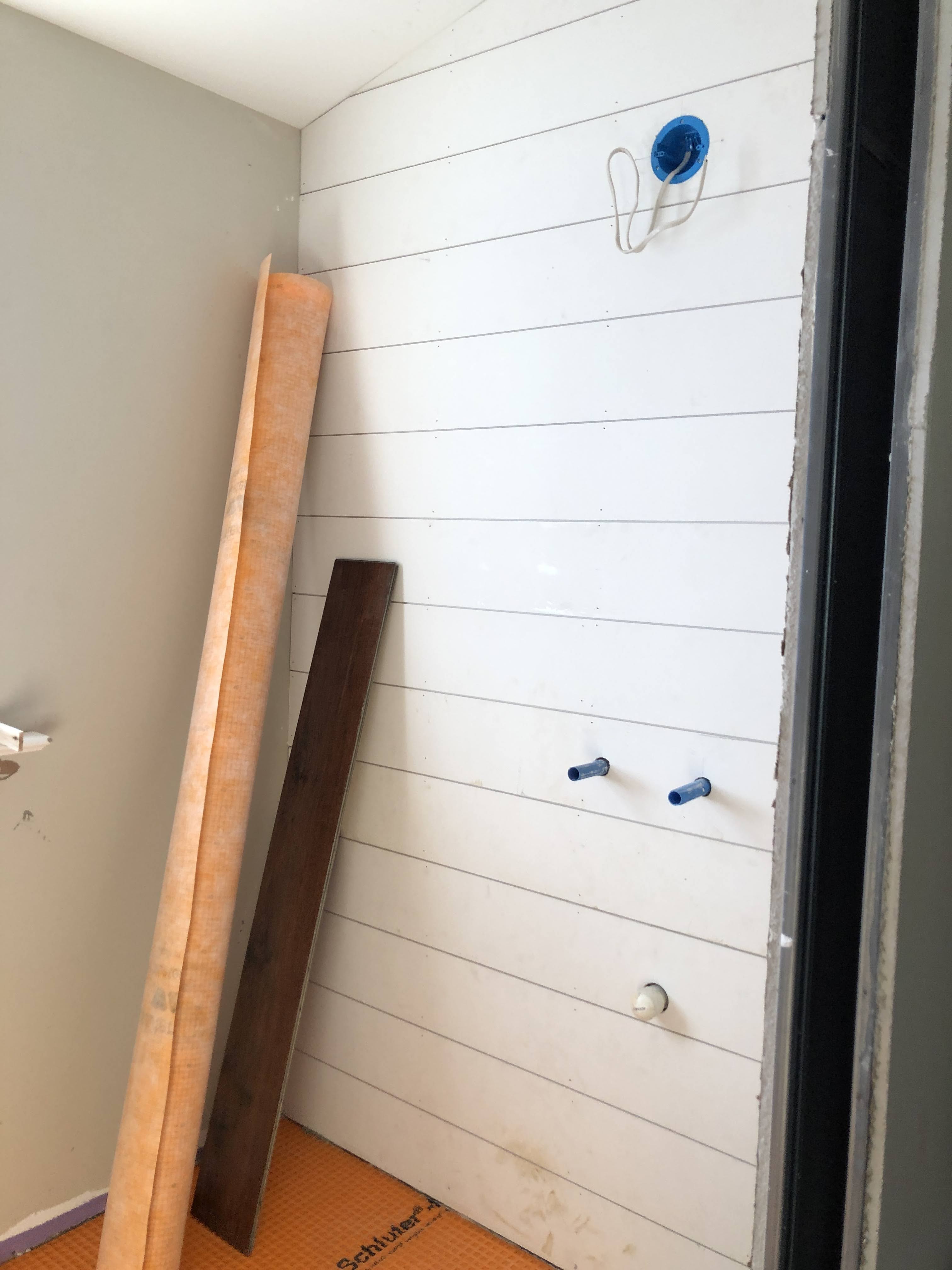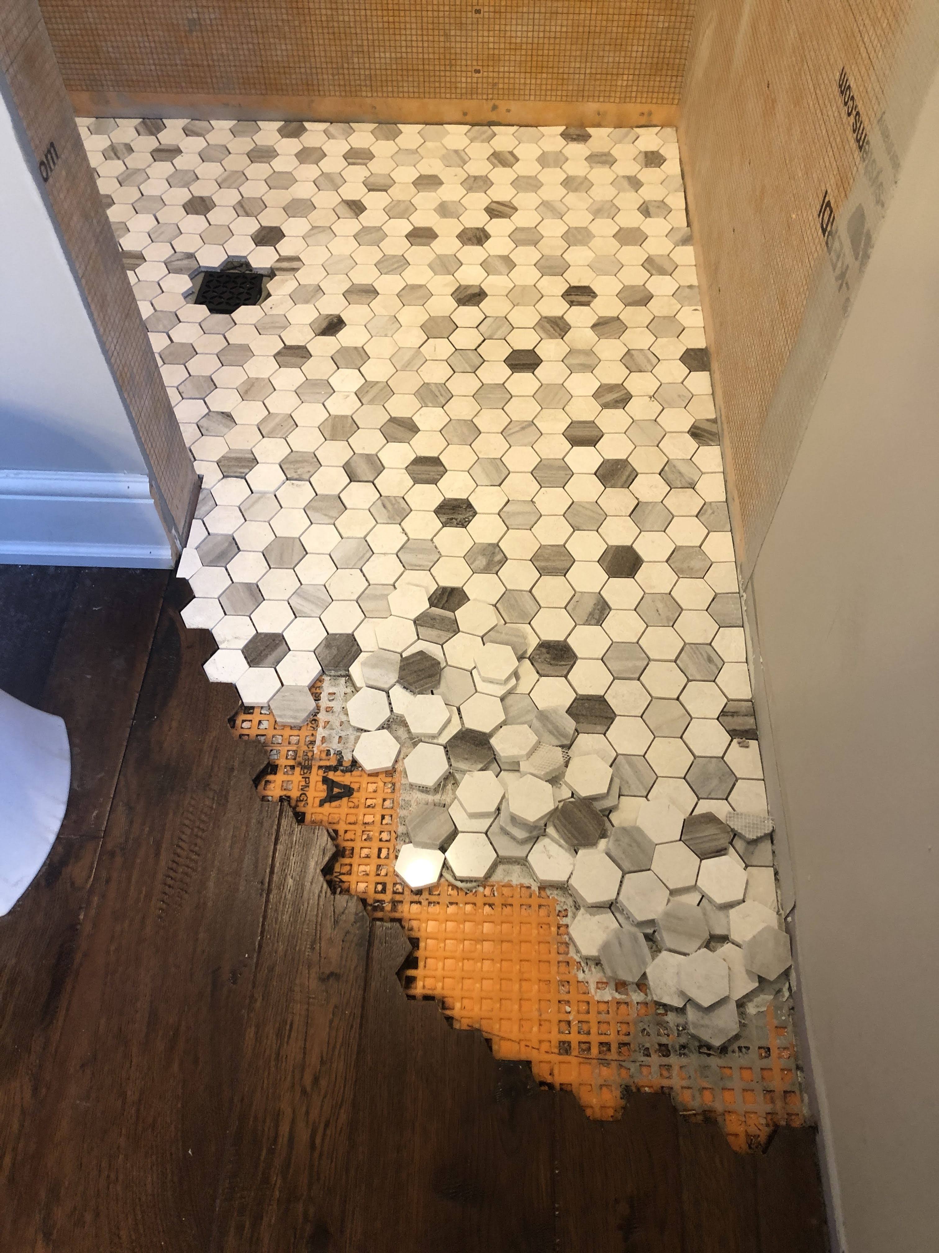 Then the contractor finished up the plumbing and shower install. I had designed a curbless shower for accessibility, and wanted the tile to spill out into the main floor area for visual affect and to protect the wood floor from too much water, so I cut apart a tile sheet and laid them out and the contractor had his guys cut back the wood flooring with his multi-tool.