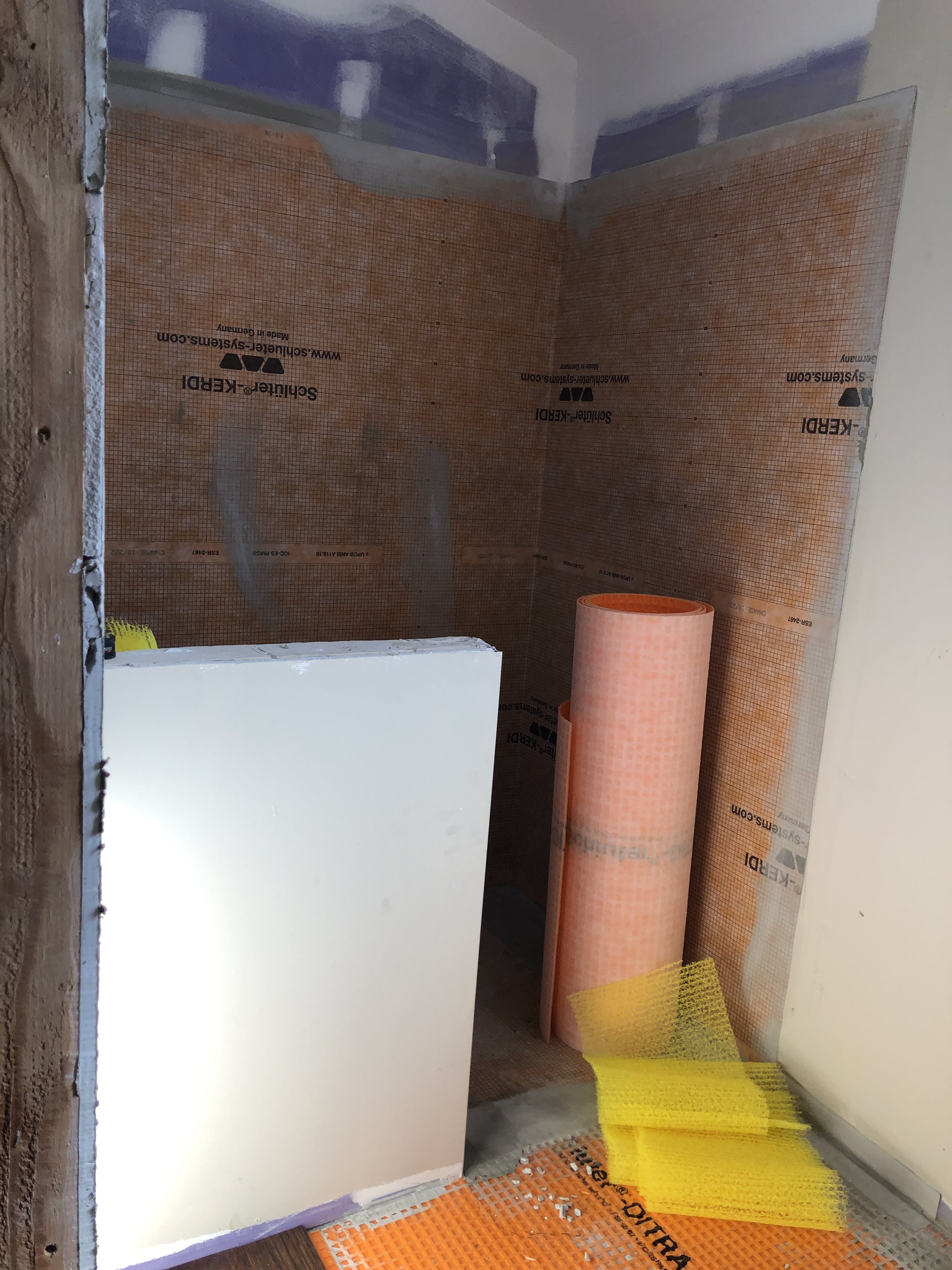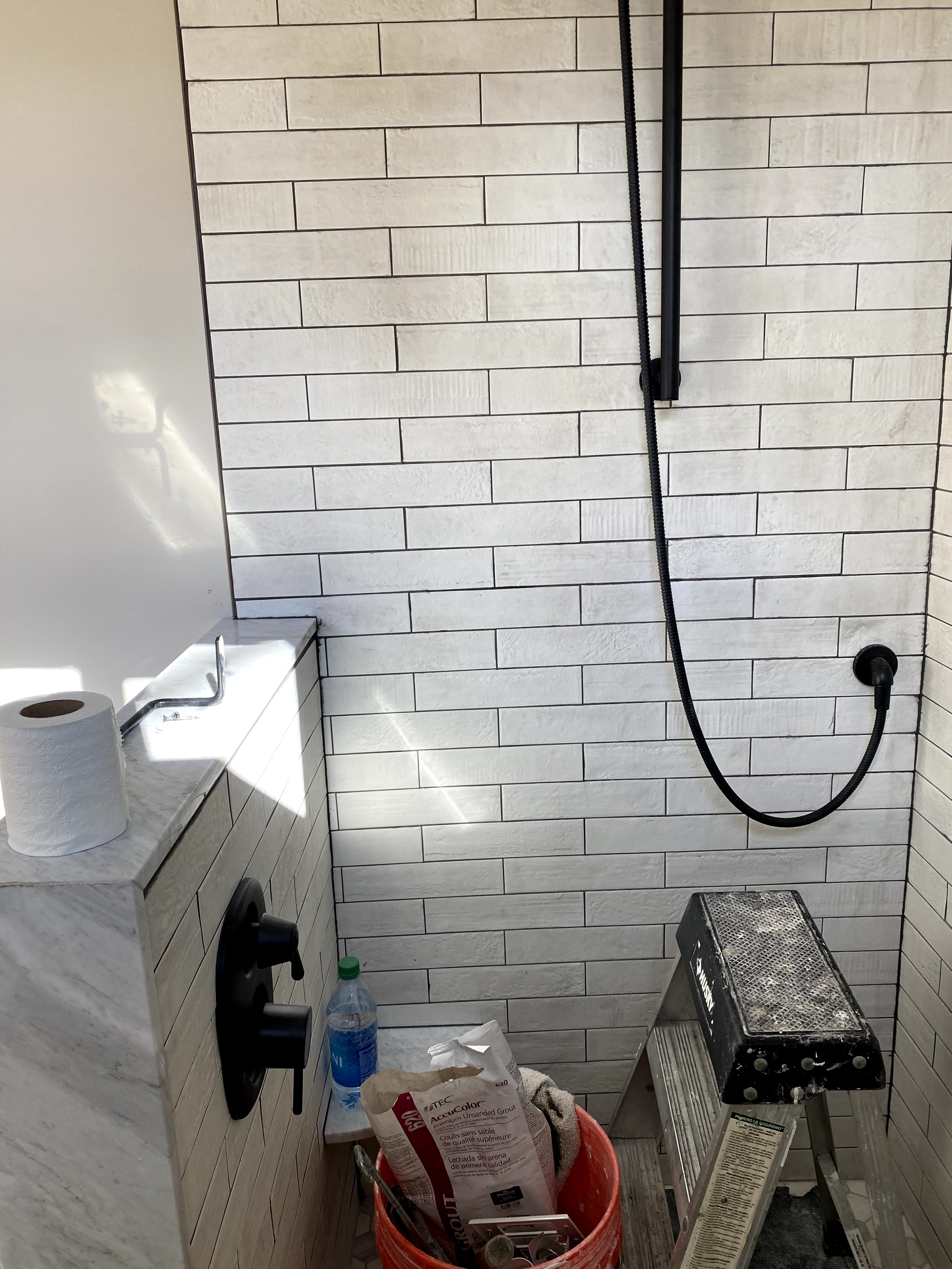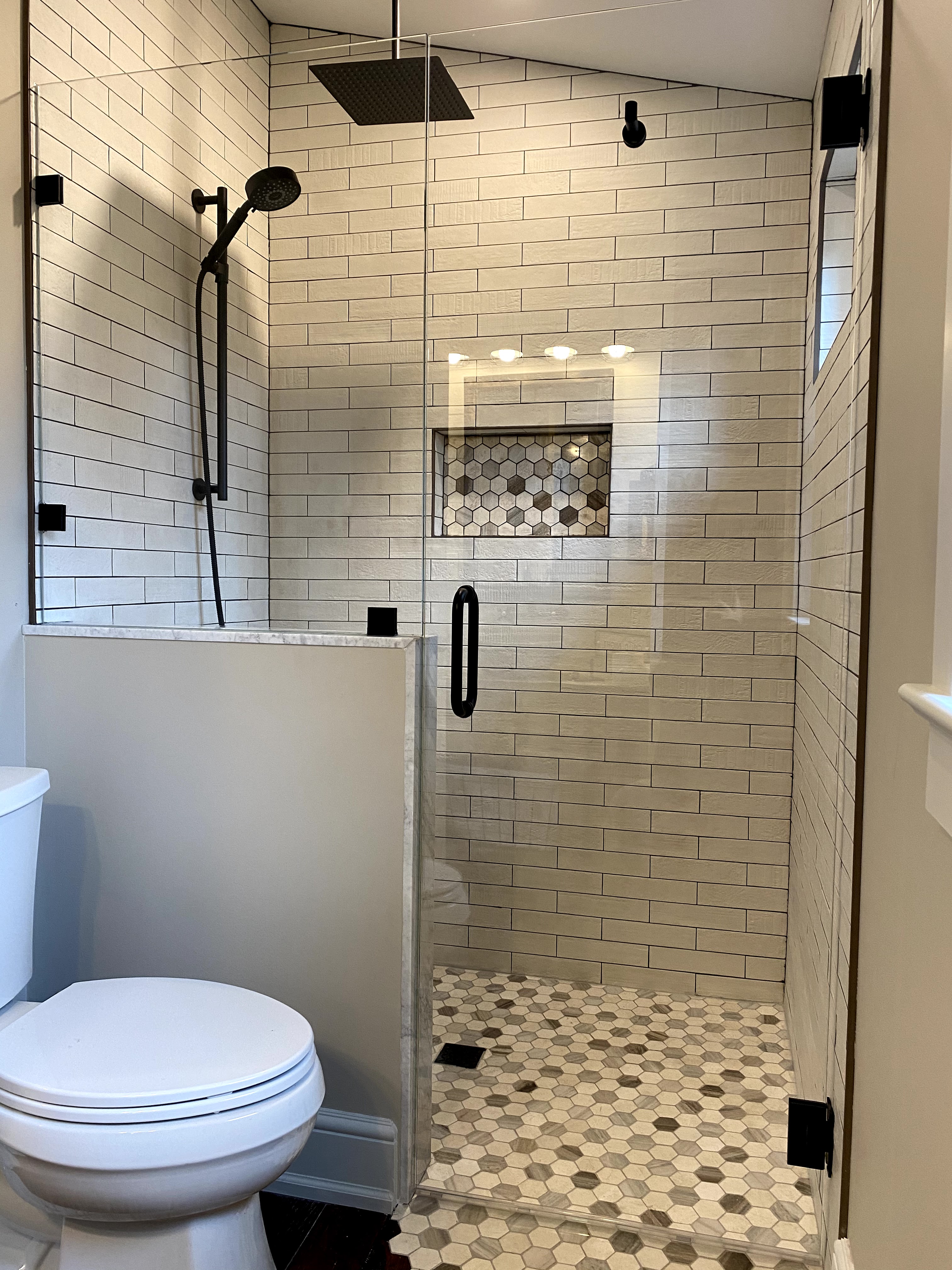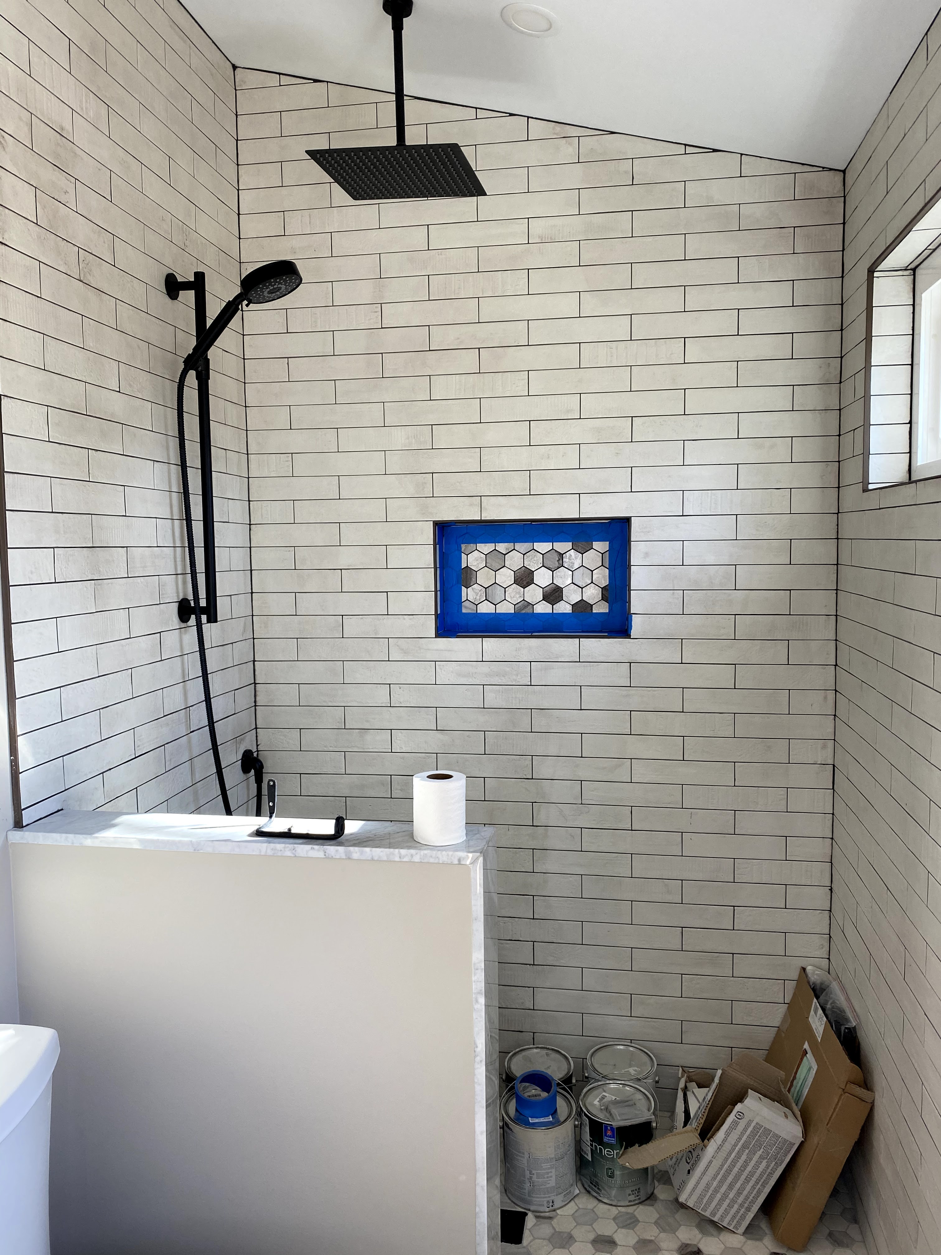 Then the contractor finished up the plumbing and shower install. I had designed a curbless shower for accessibility, and wanted the tile to spill out into the main floor area for visual affect and to protect the wood floor from too much water, so I cut apart a tile sheet and laid them out and the contractor had his guys cut back the wood flooring with his multi-tool.