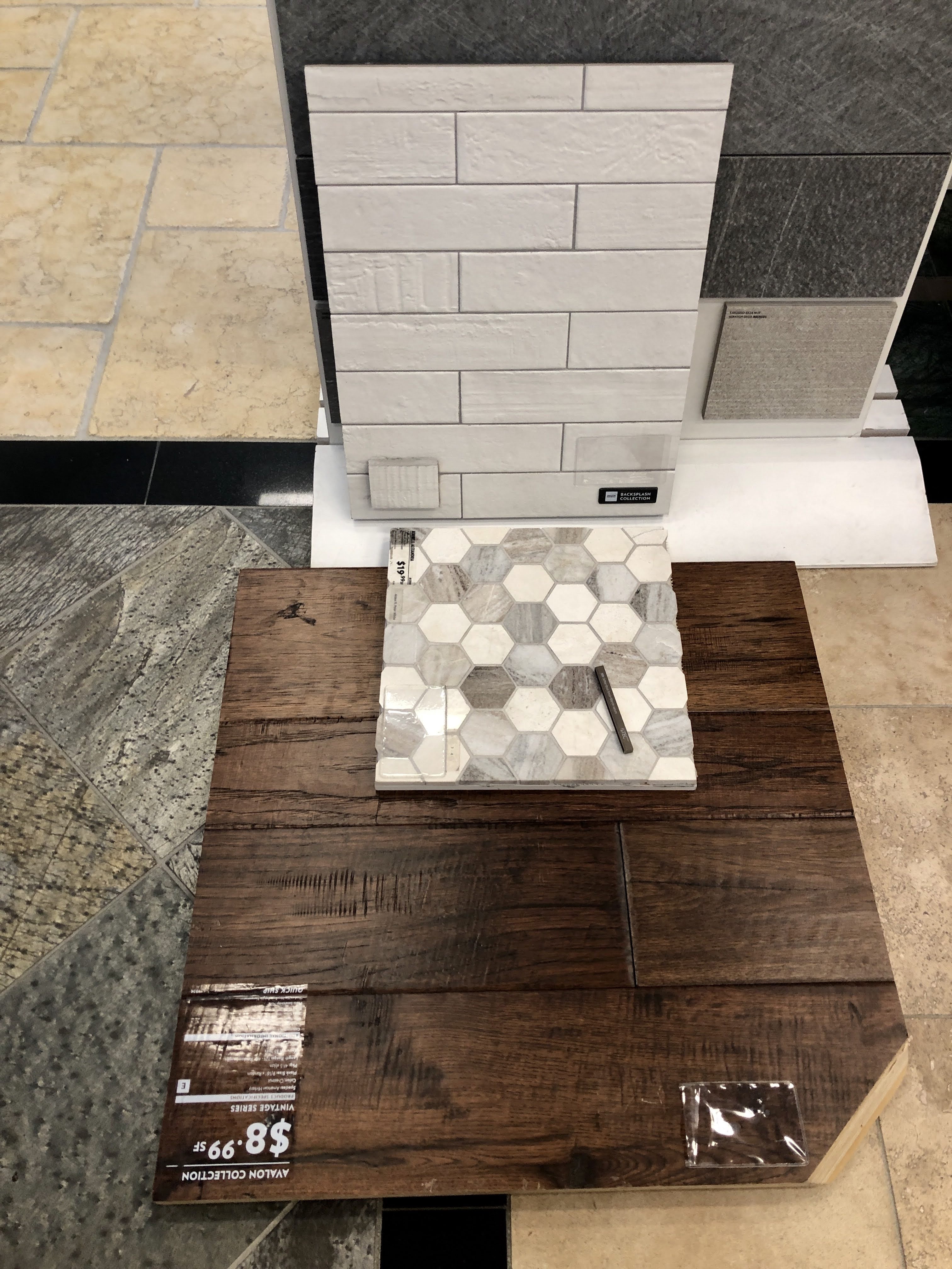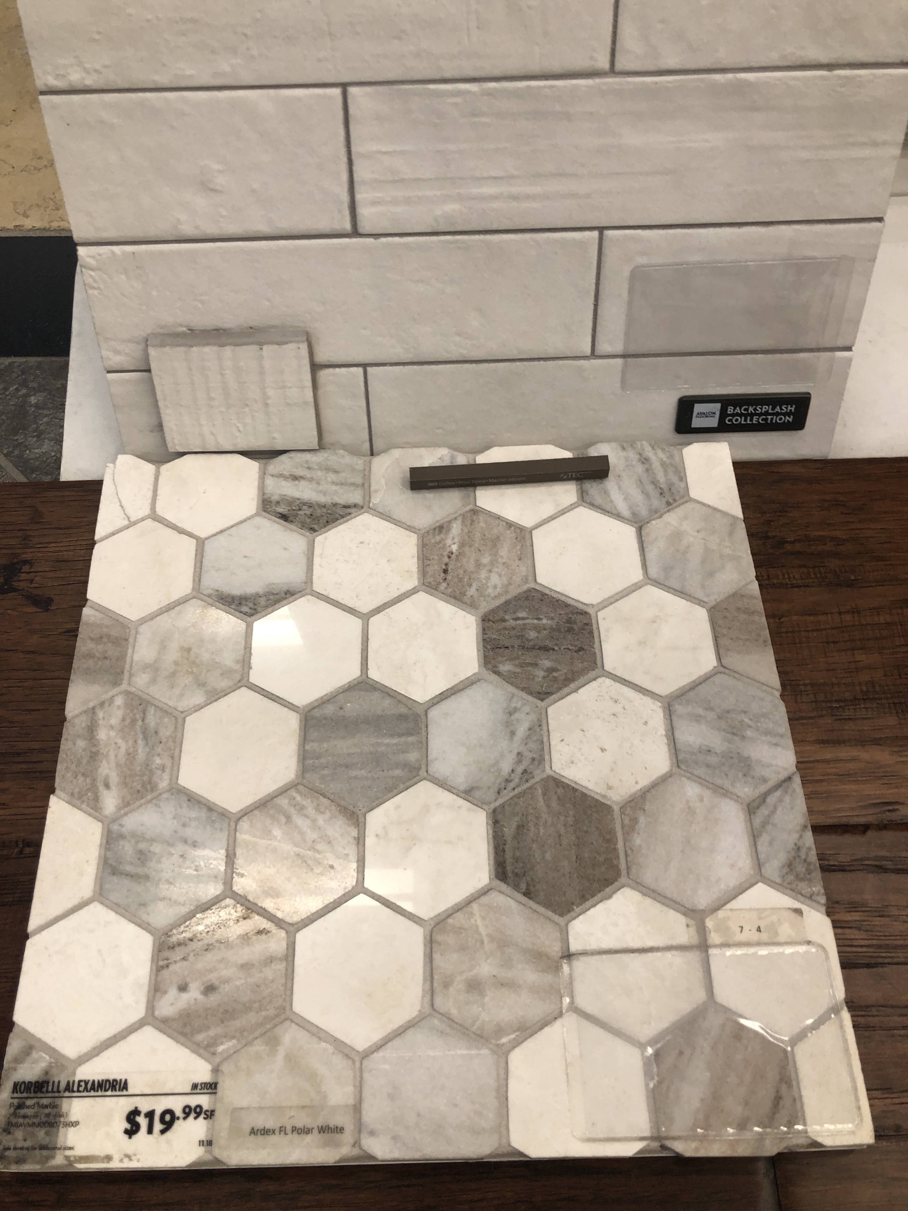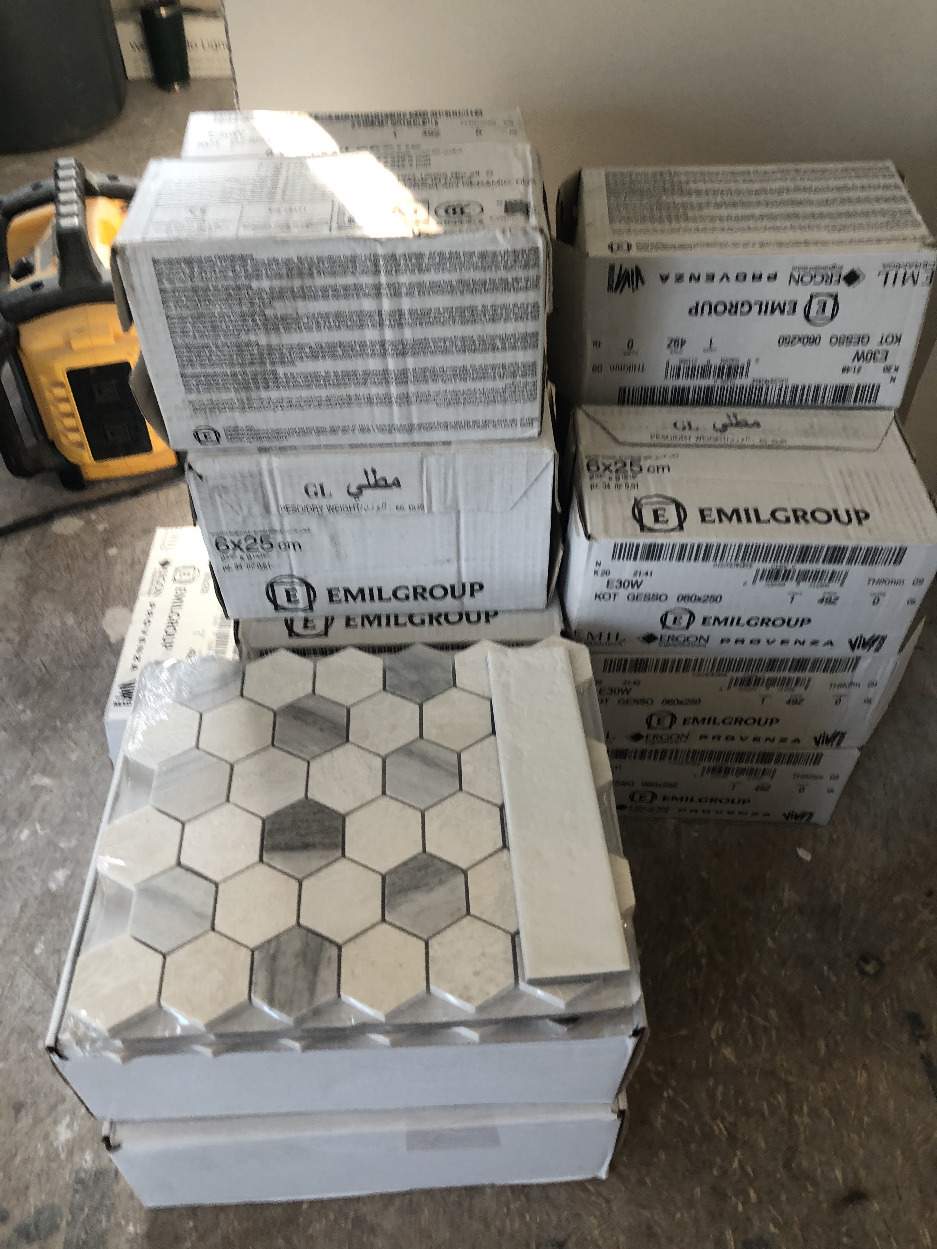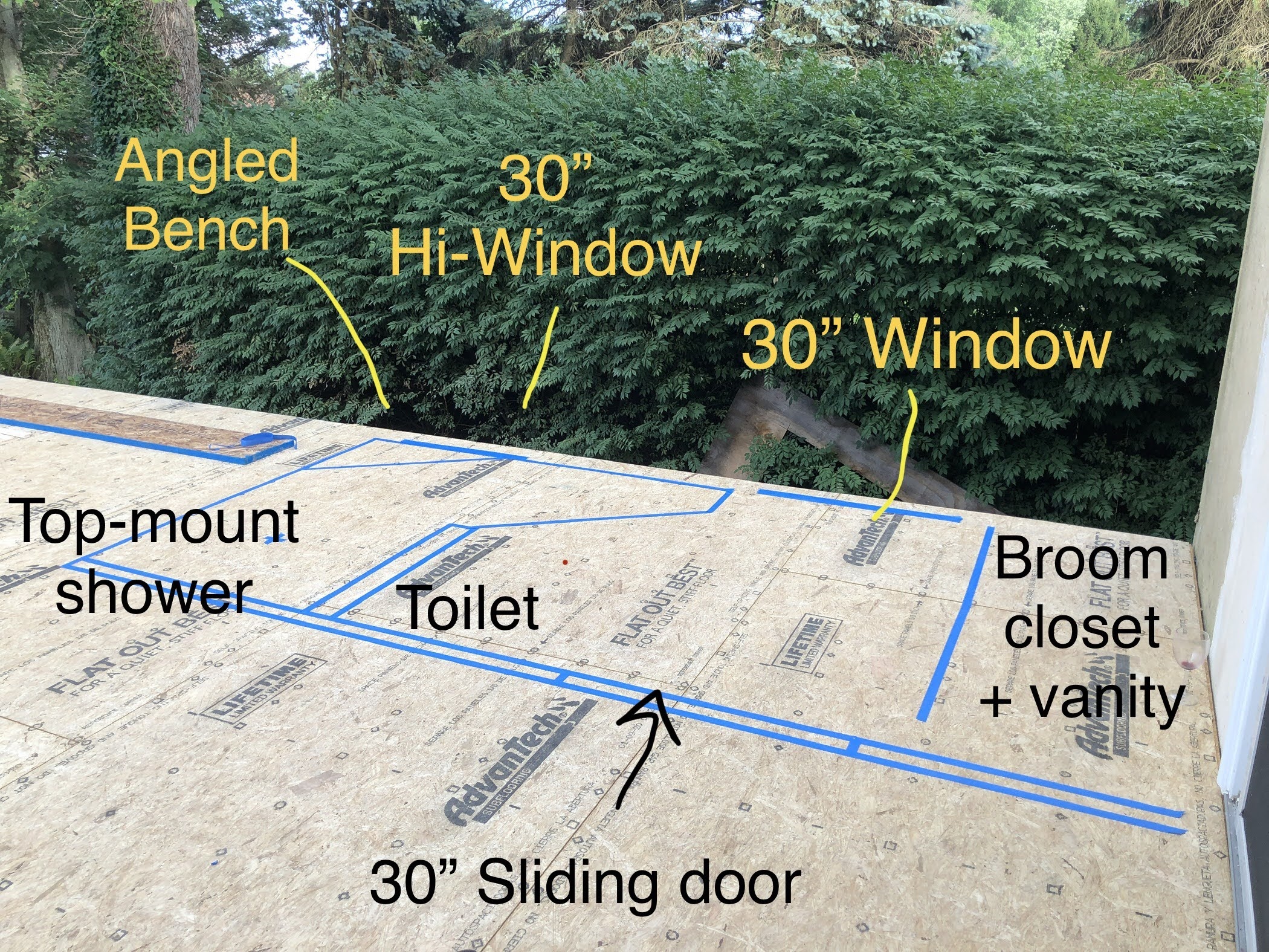 Then the contractor finished up the plumbing and shower install. I had designed a curbless shower for accessibility, and wanted the tile to spill out into the main floor area for visual affect and to protect the wood floor from too much water, so I cut apart a tile sheet and laid them out and the contractor had his guys cut back the wood flooring with his multi-tool.