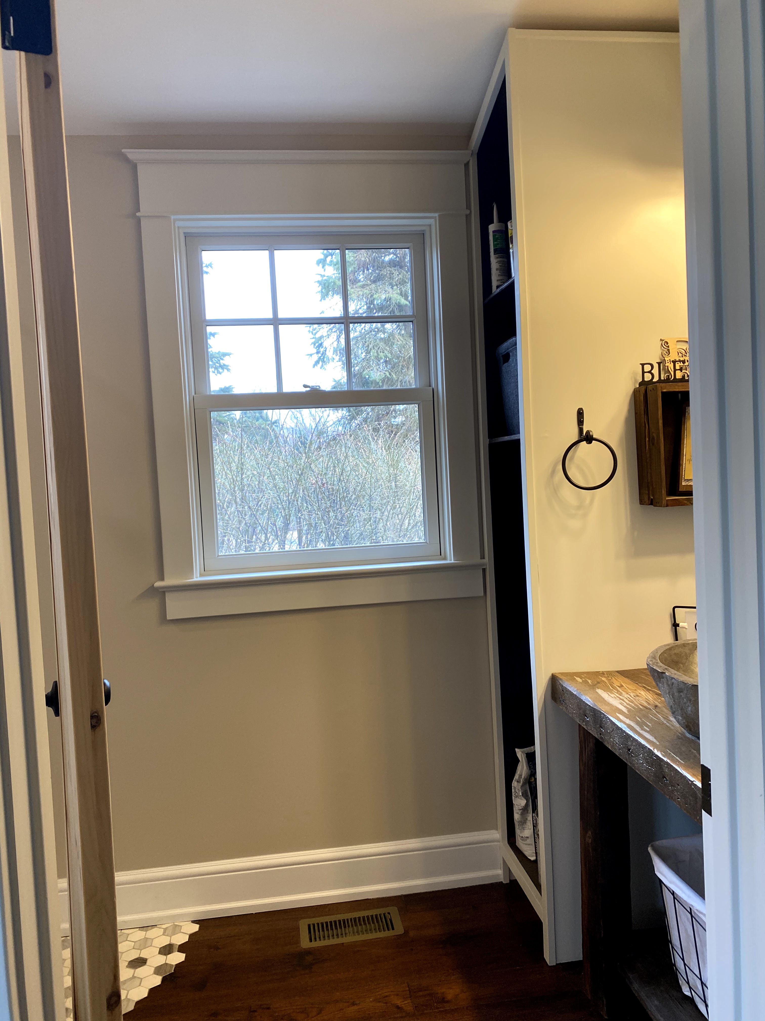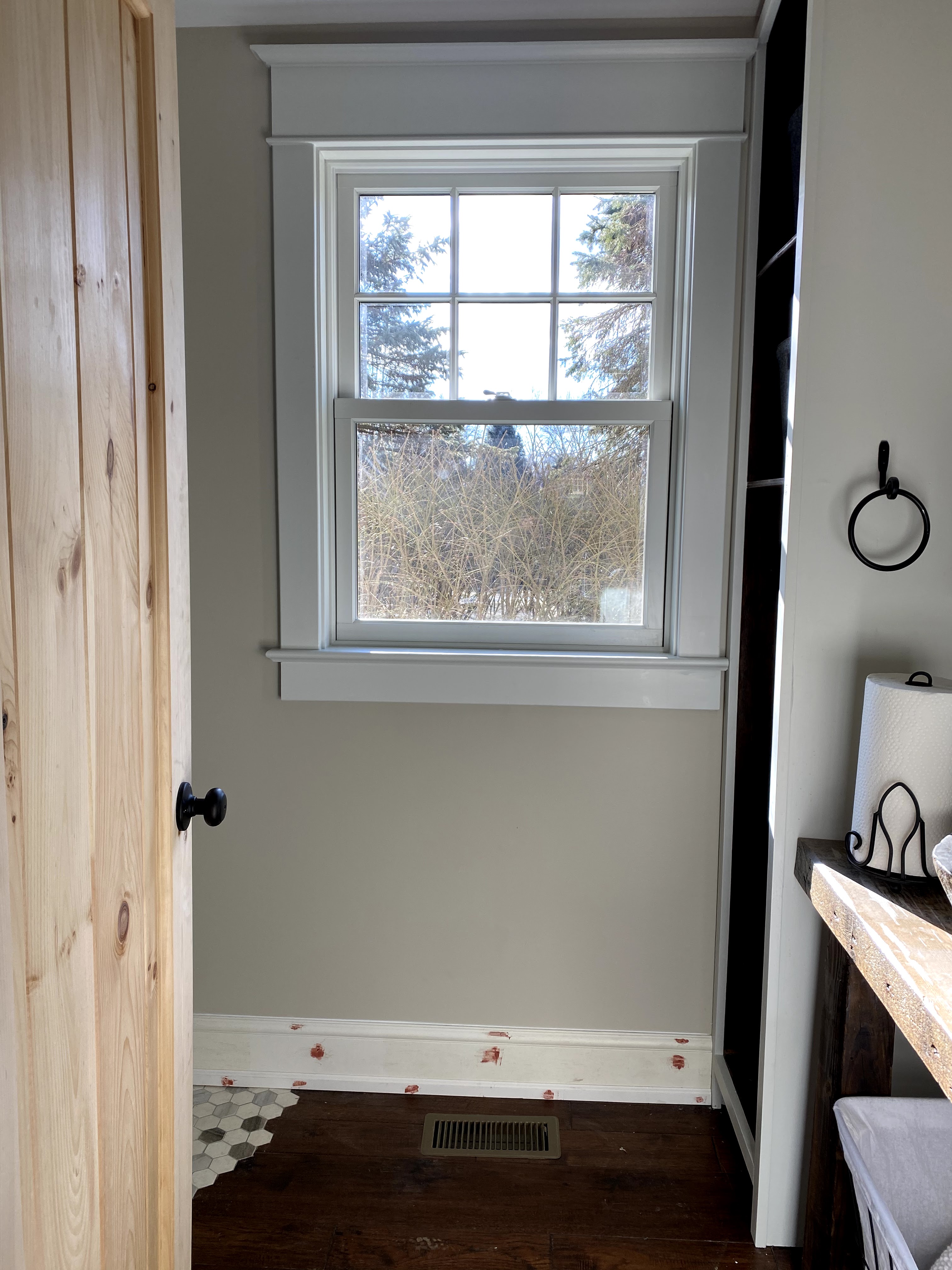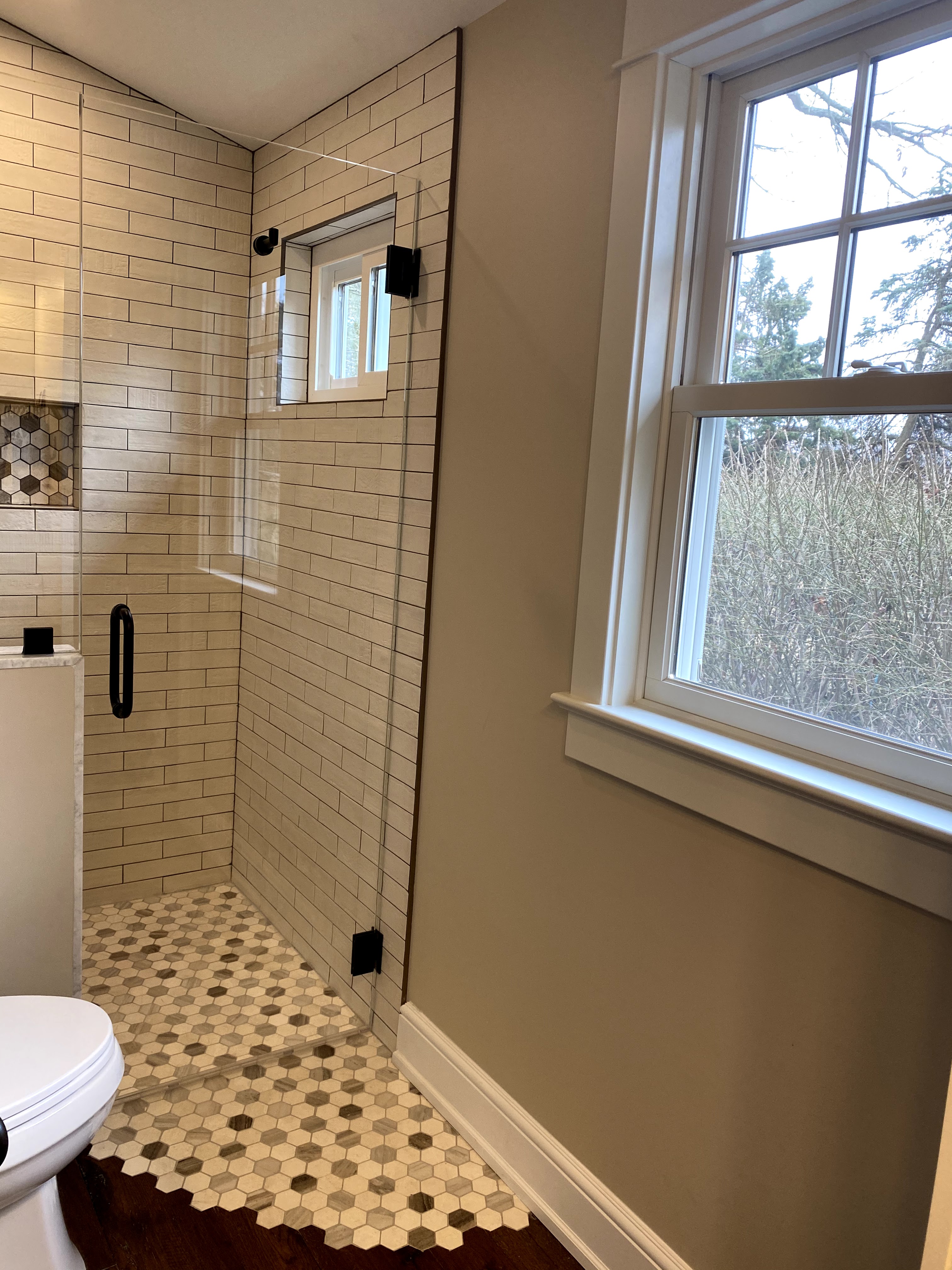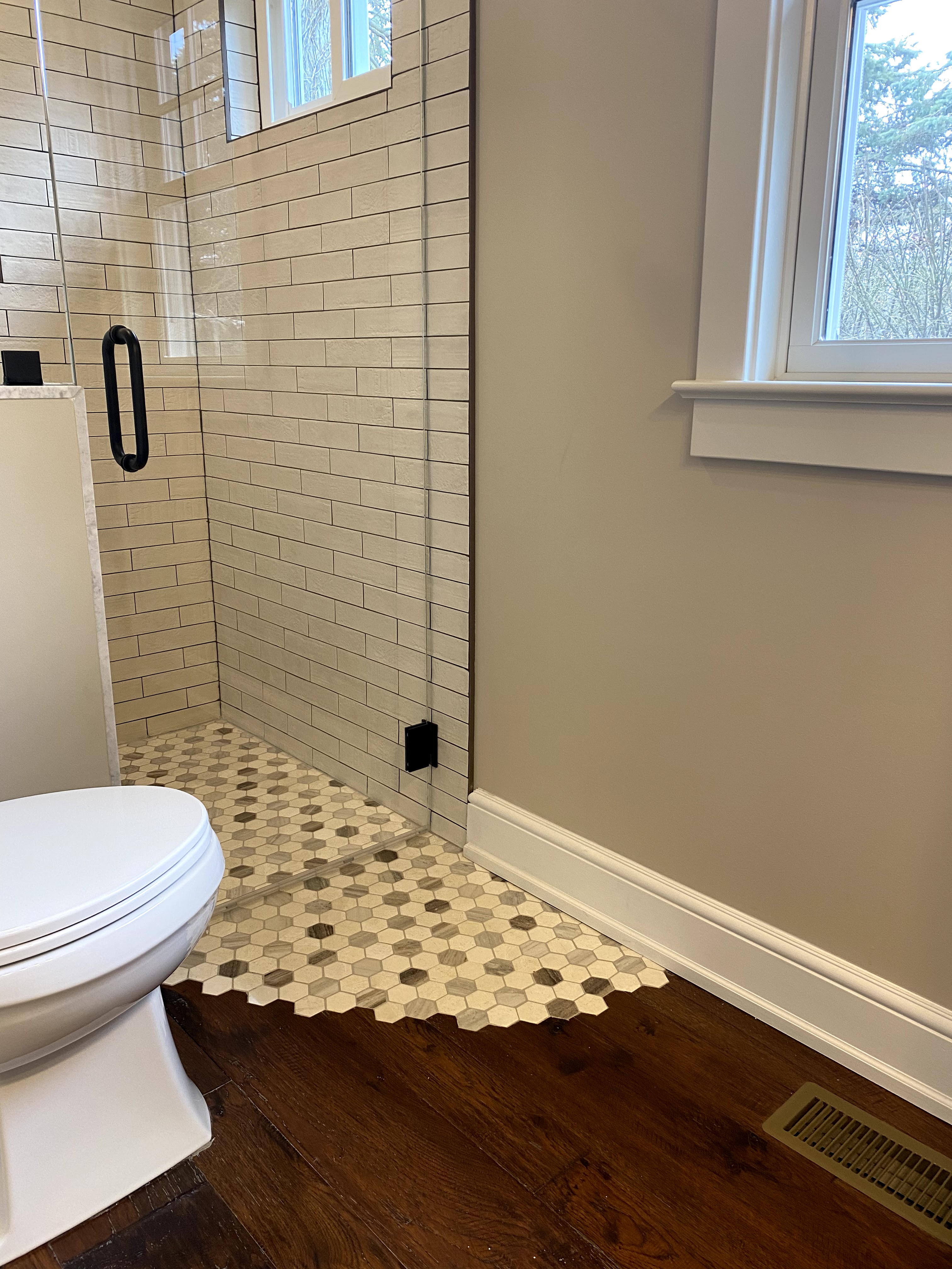 I had very specific requirements for the bathroom for the Garden Room addition. Having personally needed respite care on multiple occasions, along with having family and friends with mobility concerns, I wanted a space that would be fully accessible and hospitable. The design needed to incorporate a significant nod to the historic 225 year old farmhouse it was being joined to. So the bathroom needed to be handicap accessible, while also checking the chic-meets-rustic design box. And it needed windows, because I am a close relation to a plant and require daylight almost at all times.