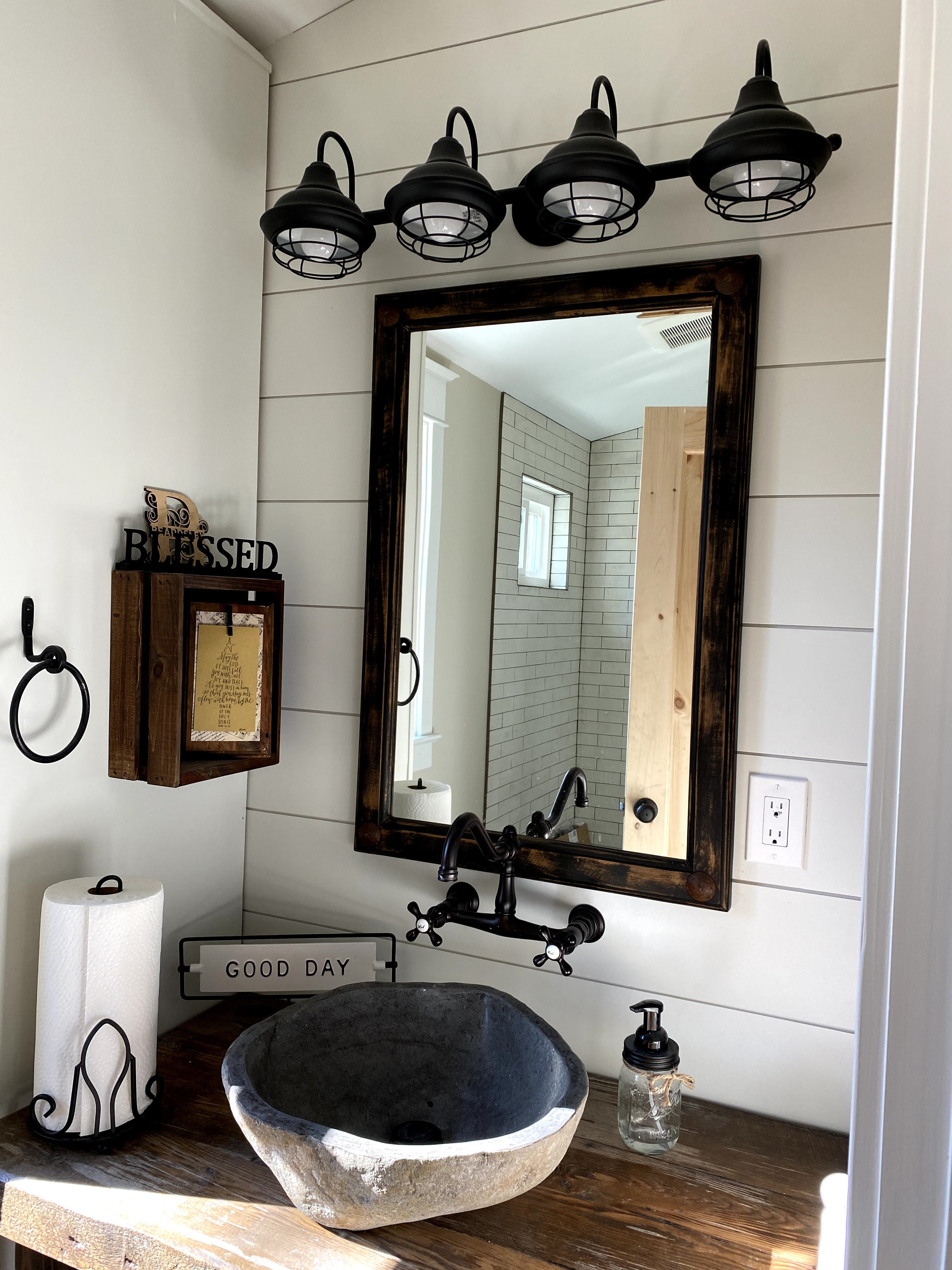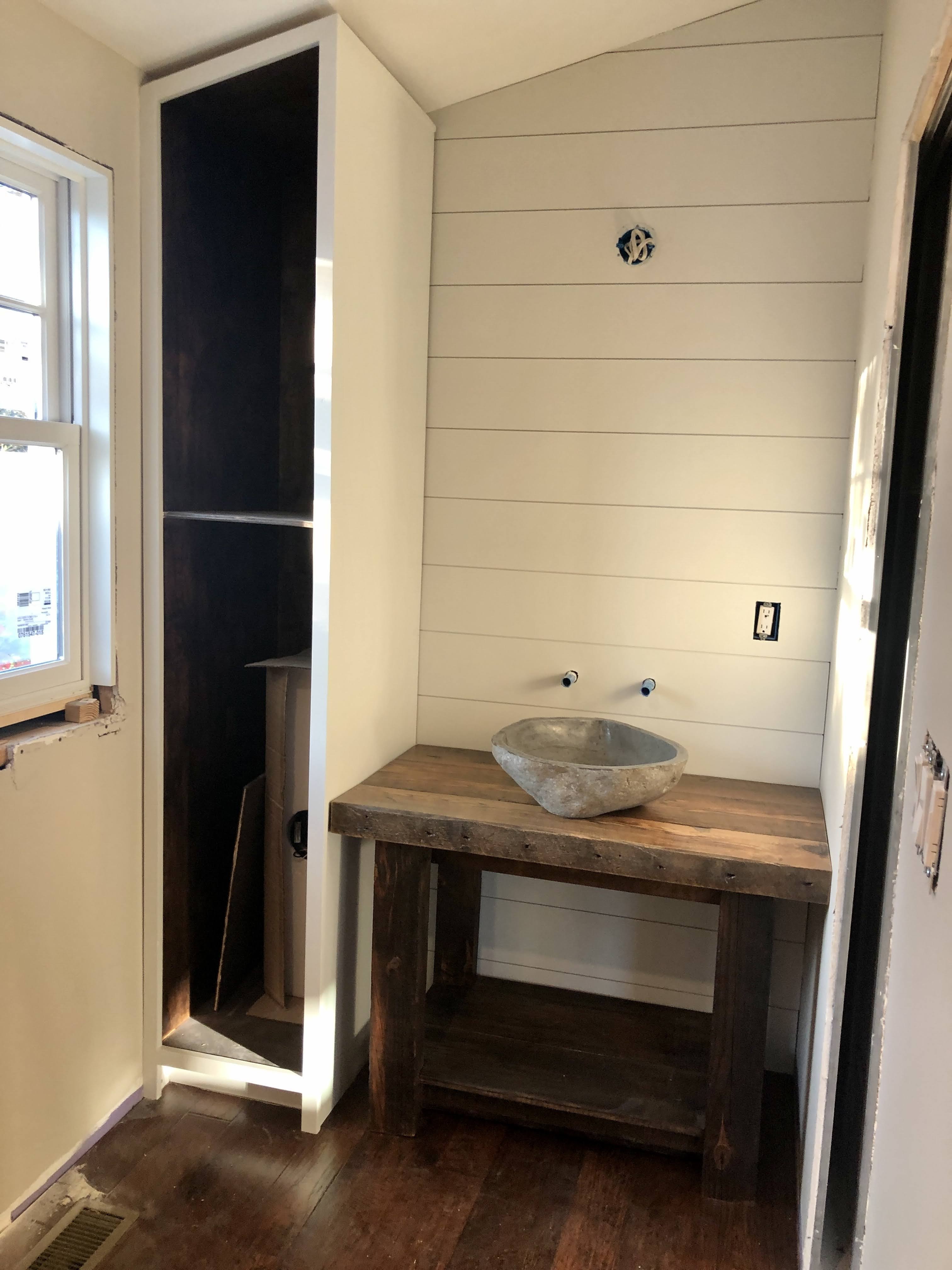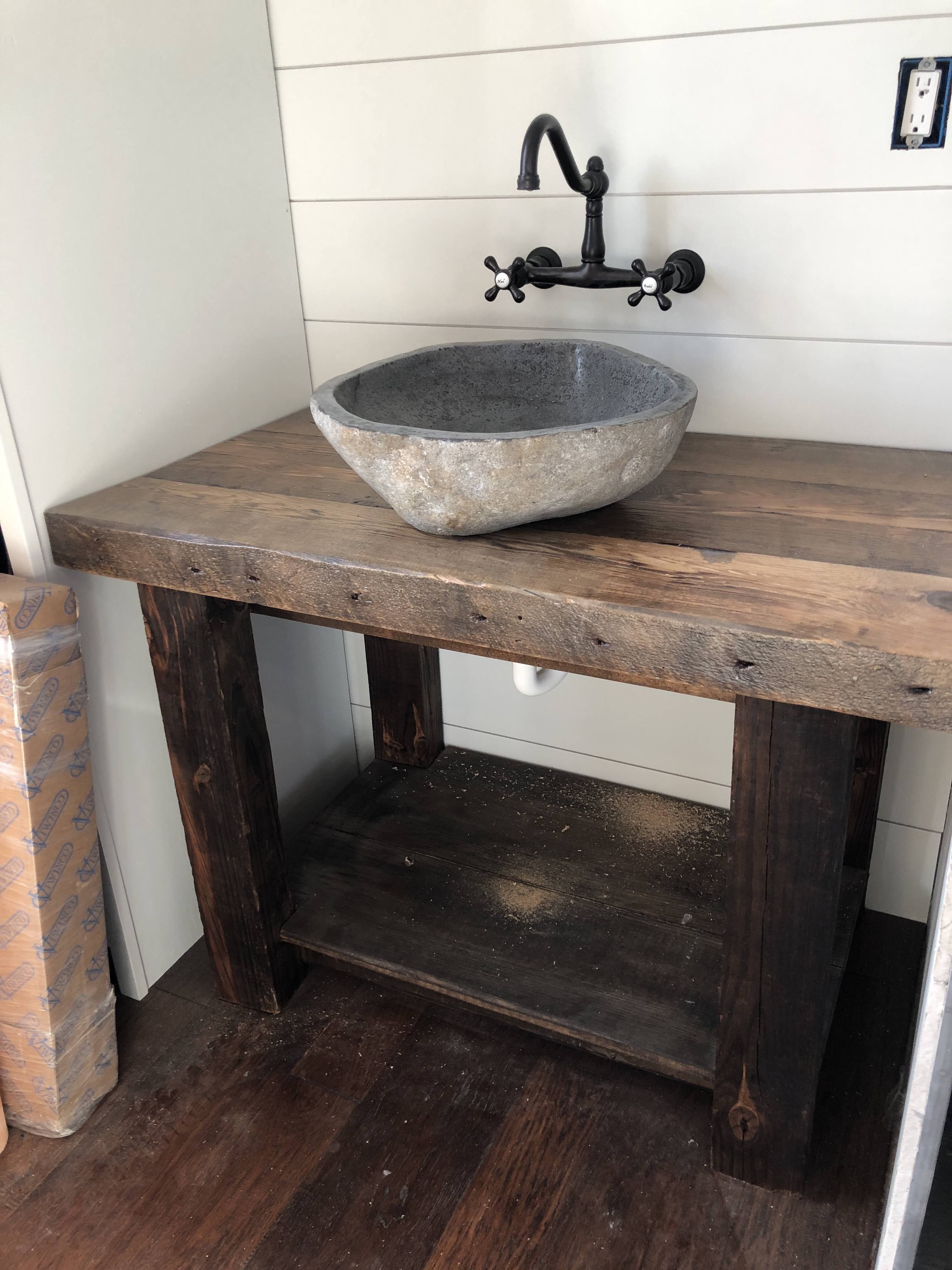 Then I realized I had plenty of reclaimed barn wood on my own property and decided to build them myself. A stone vessel sink from Wayfair would make the look complete.