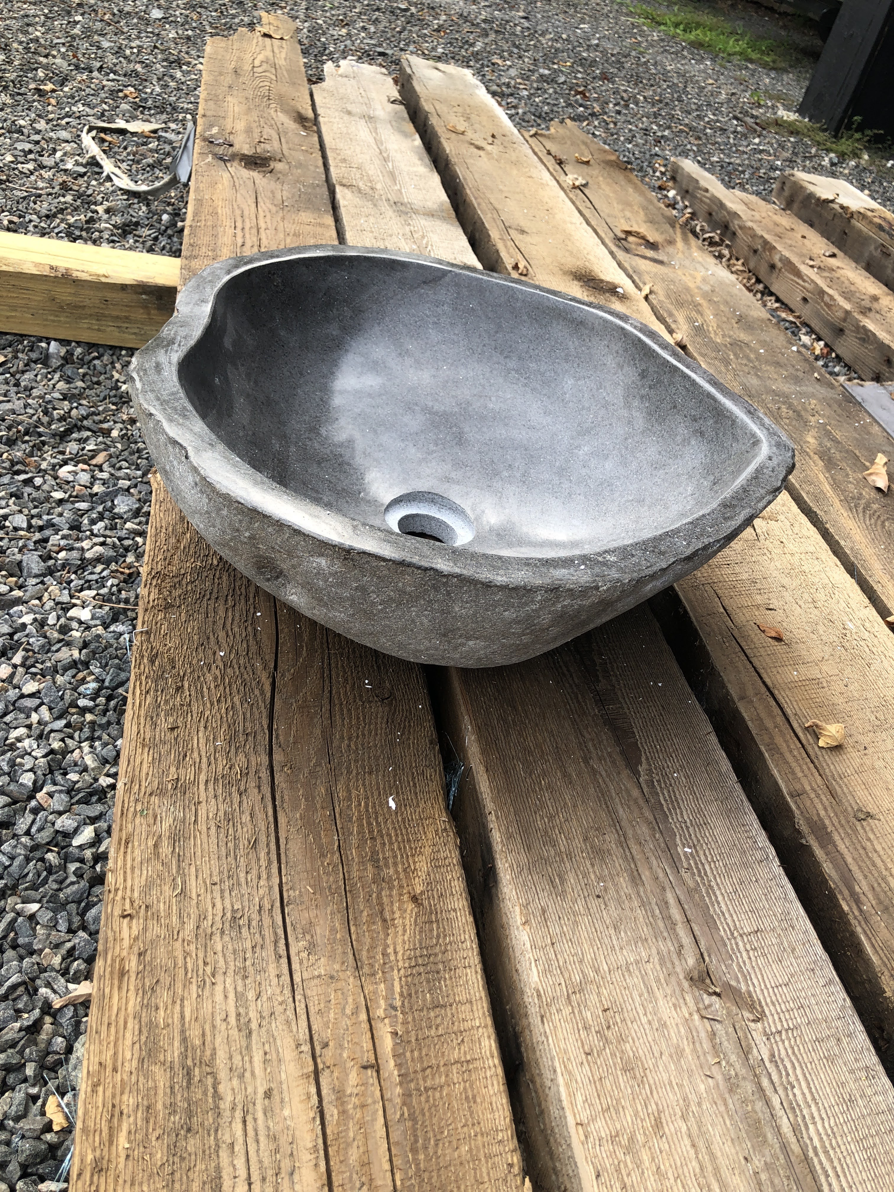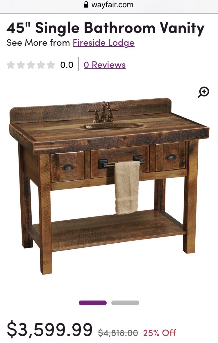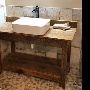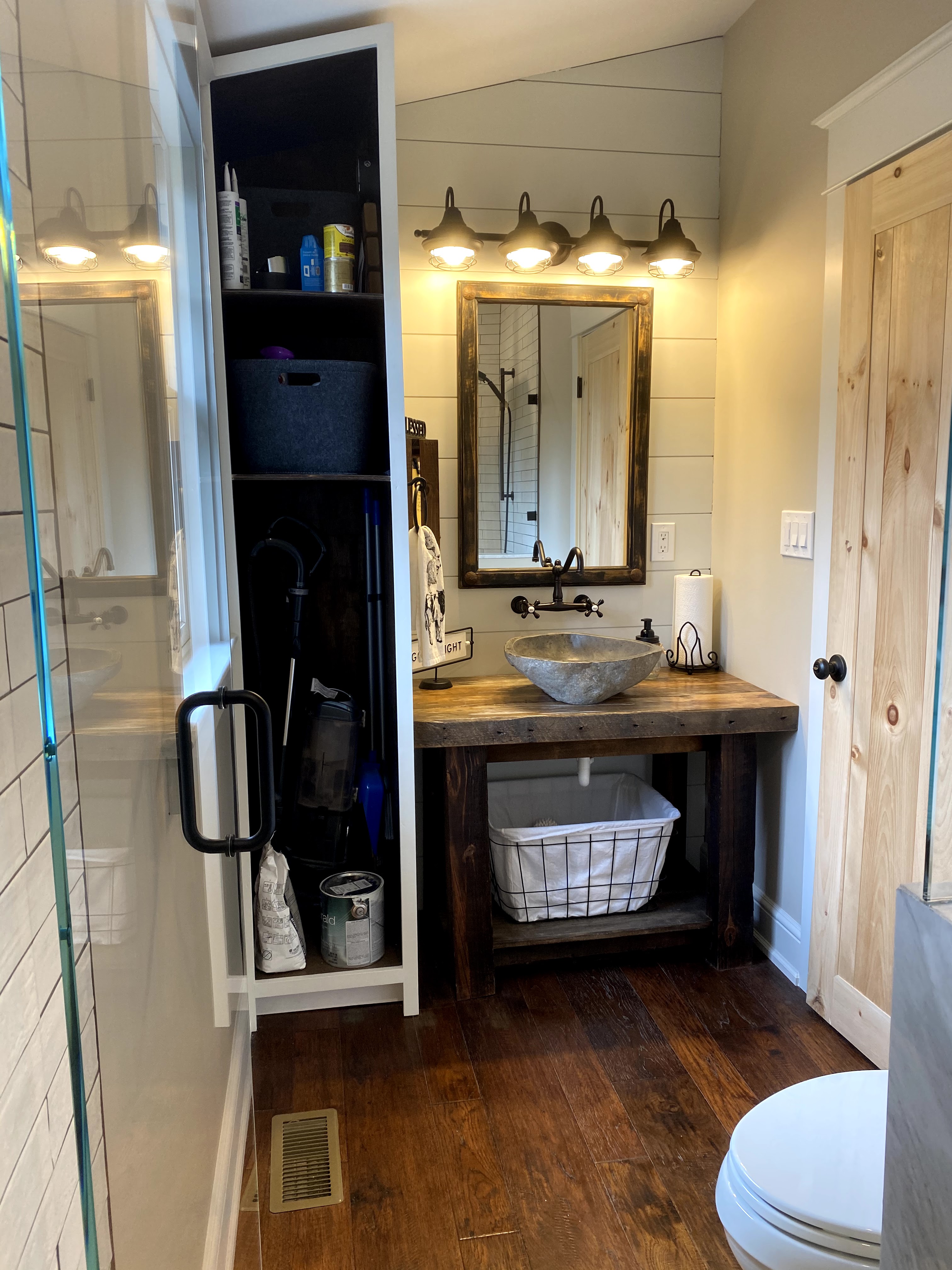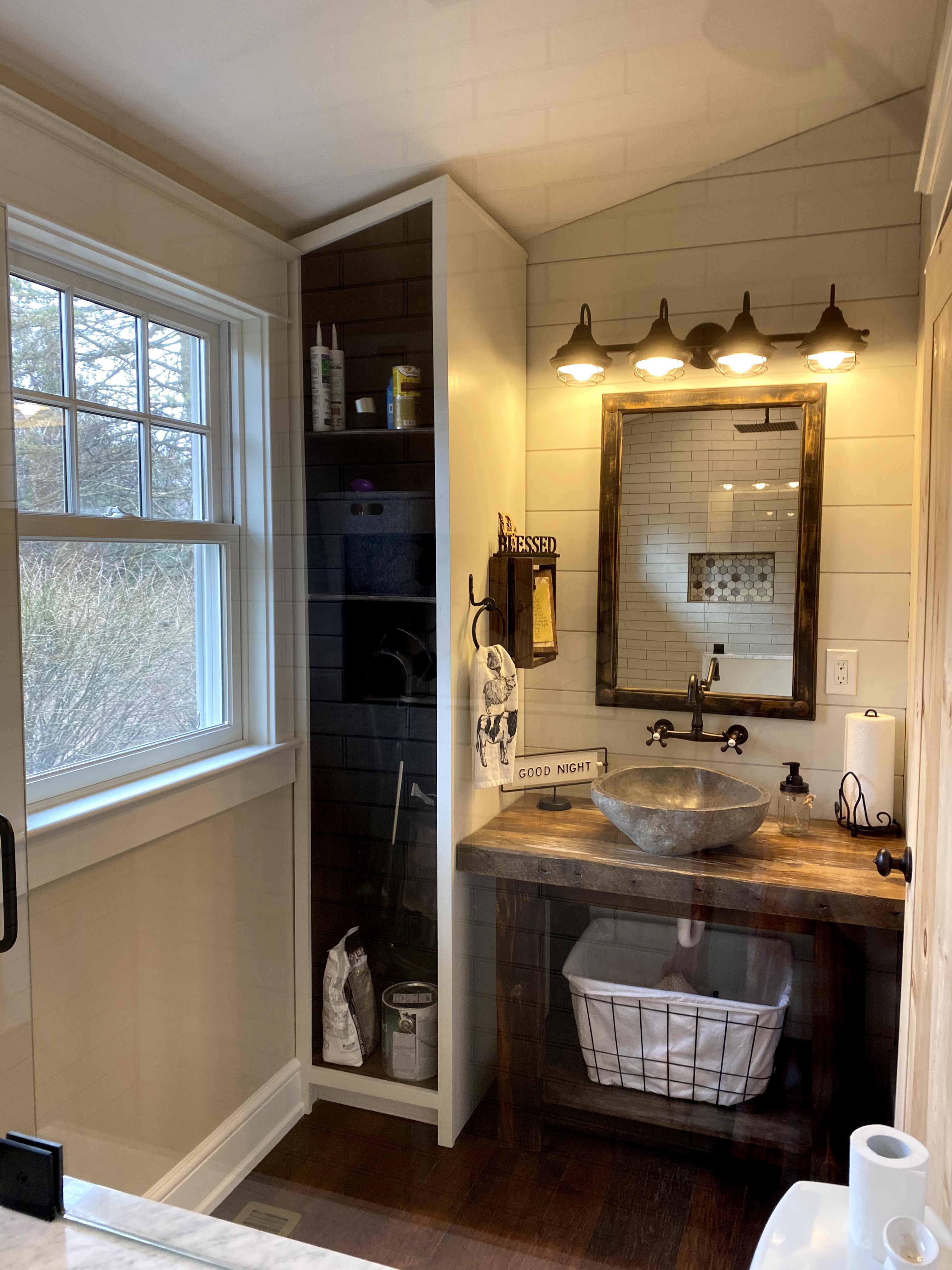 Then I realized I had plenty of reclaimed barn wood on my own property and decided to build them myself. A stone vessel sink from Wayfair would make the look complete.