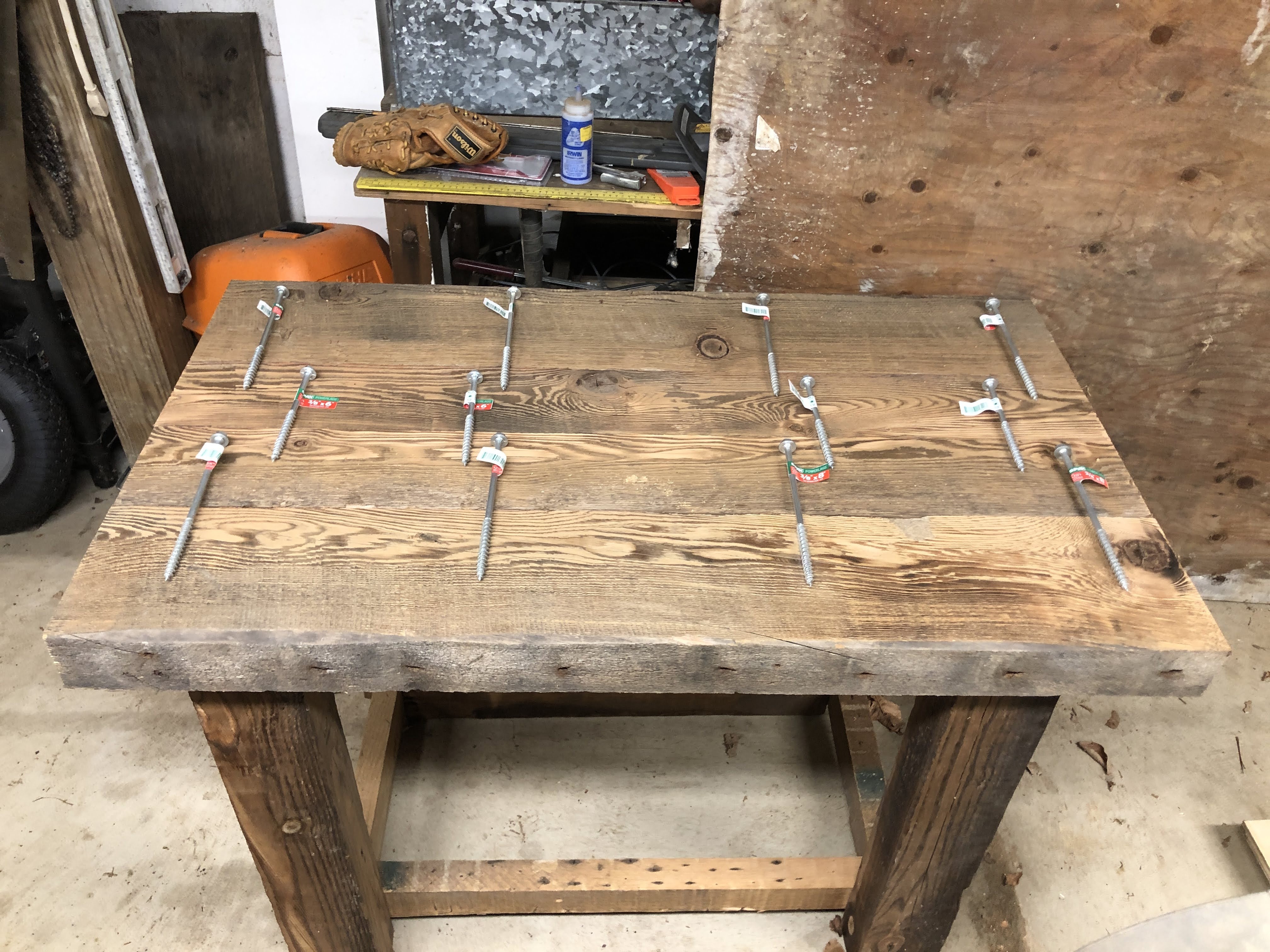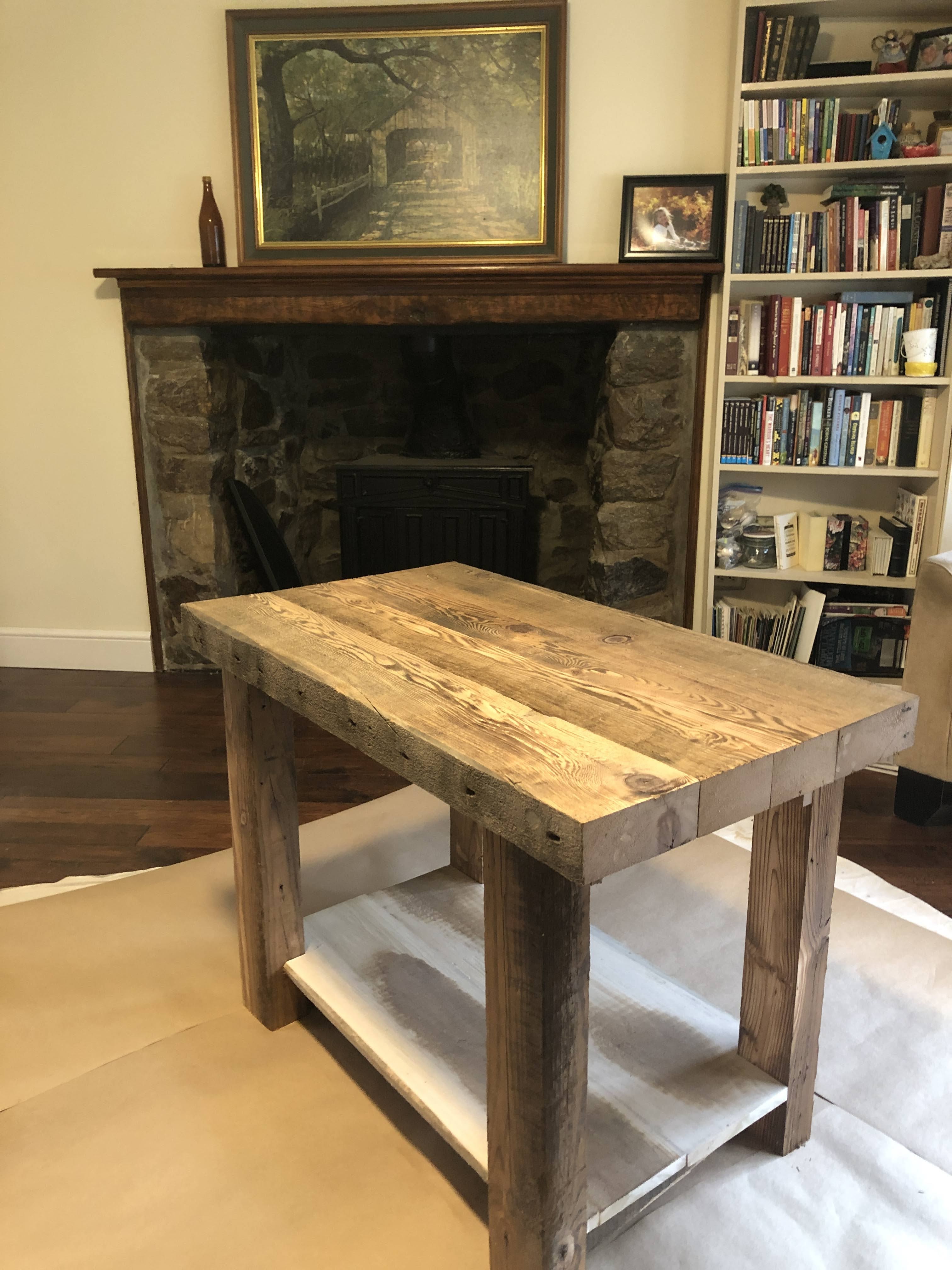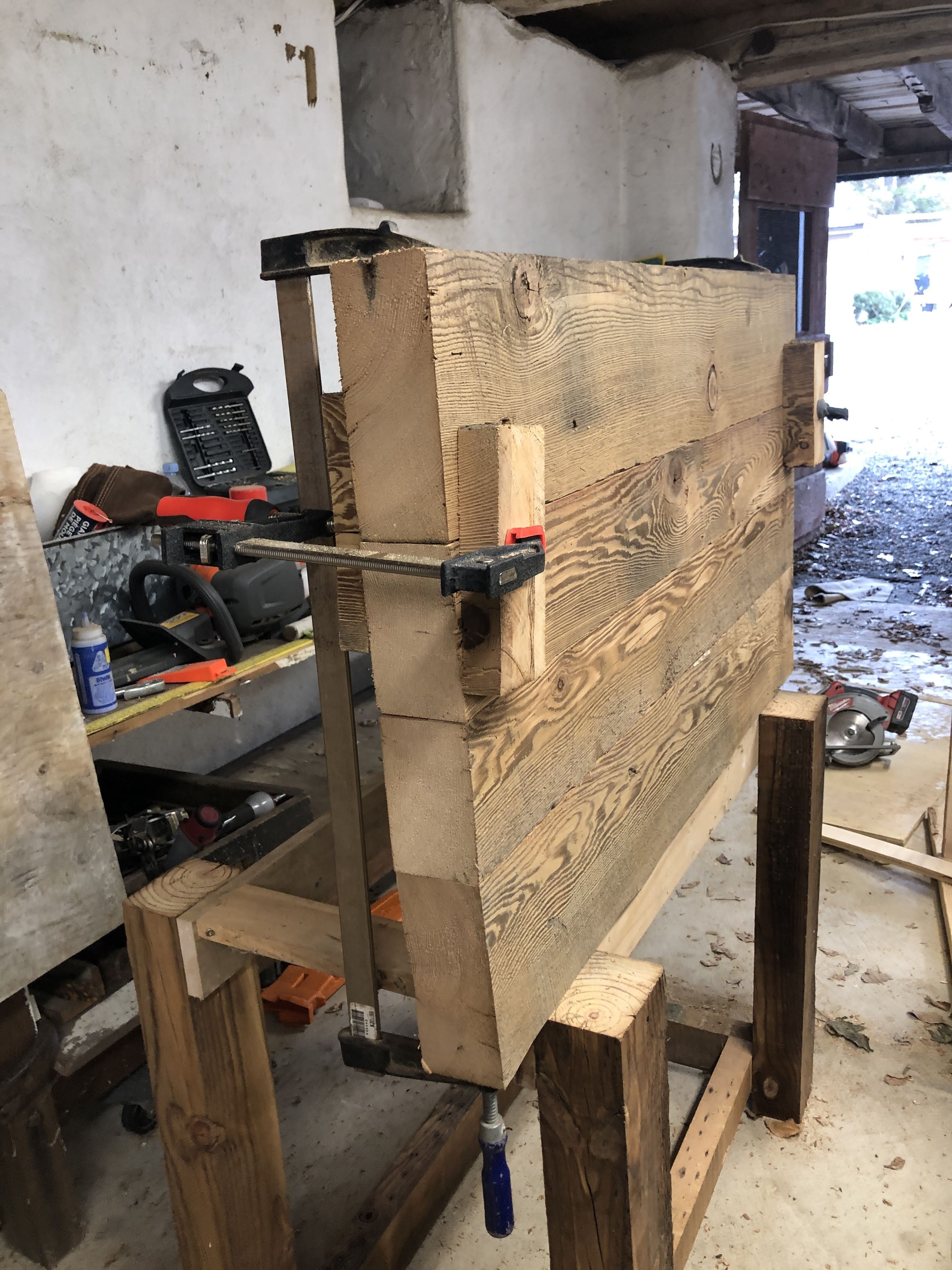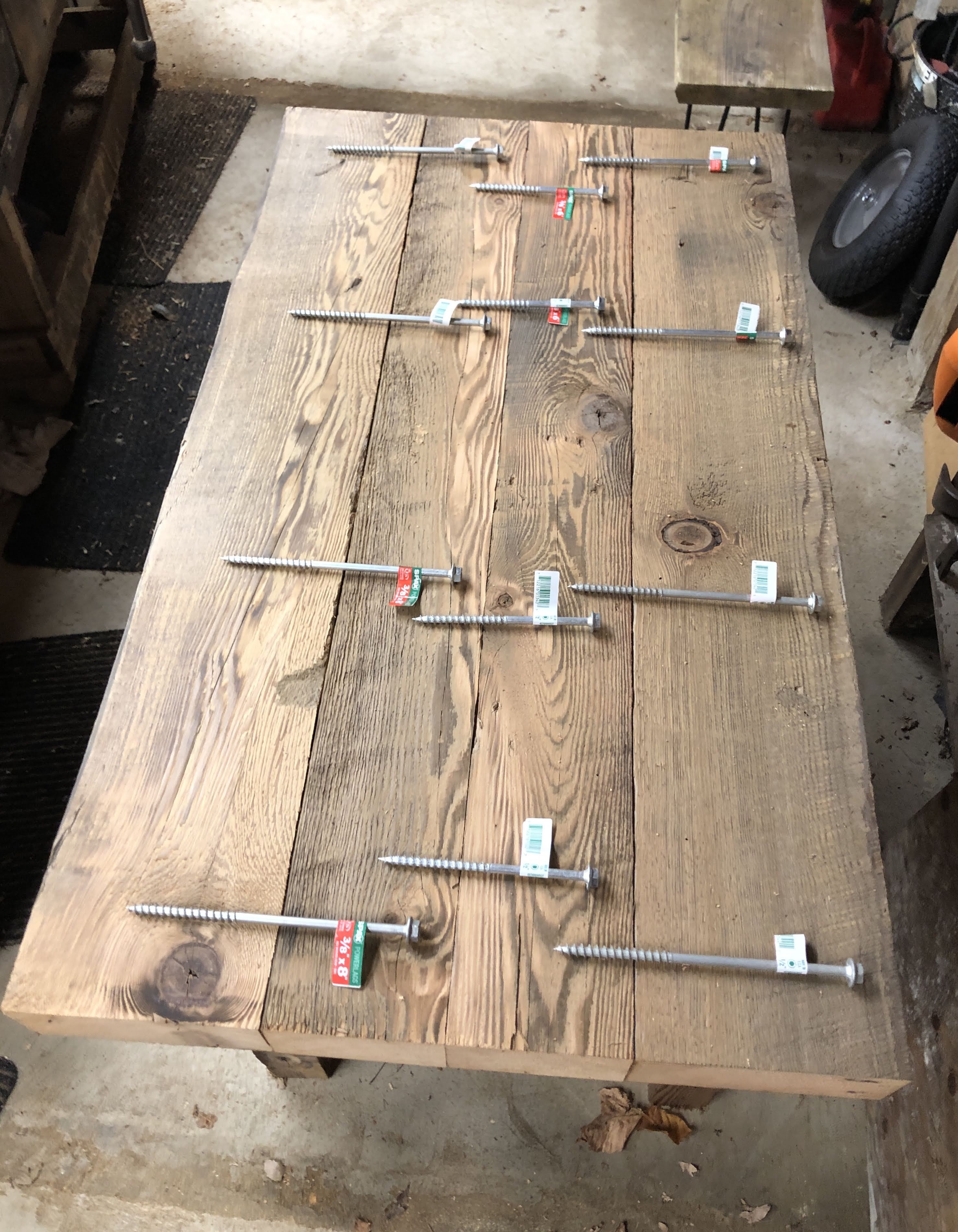 First up the vanity, with gnarly legs made out of the old laundry room rafters and the chunky counter made from the floor joists of the laundry room. The bottom shelf was cut from damaged barn boards discarded after making some siding repairs to the barn last summer. The larger lumber all had 100 year old nails in them so I could tell they were used elsewhere before their most recent job description. I planed them all down for uniform dimensions where needed and cut them to length. The counter top was joined together with a combination of 6″ and 8″ lag bolts. I stained the legs and left the top natural, with a poly finish so it could be cleaned.