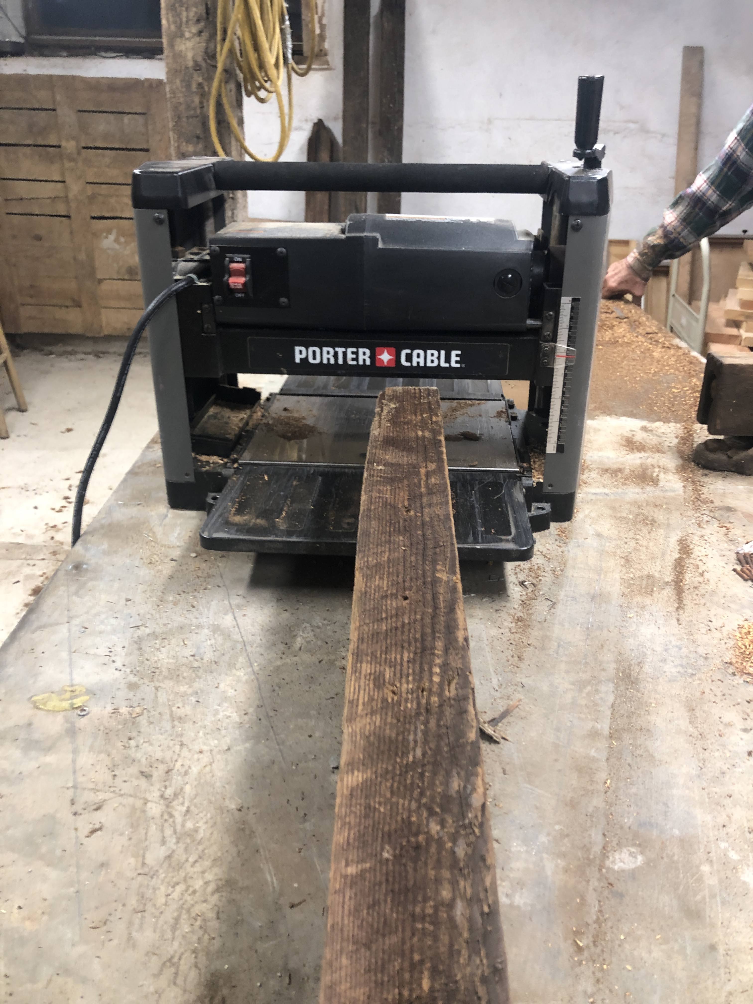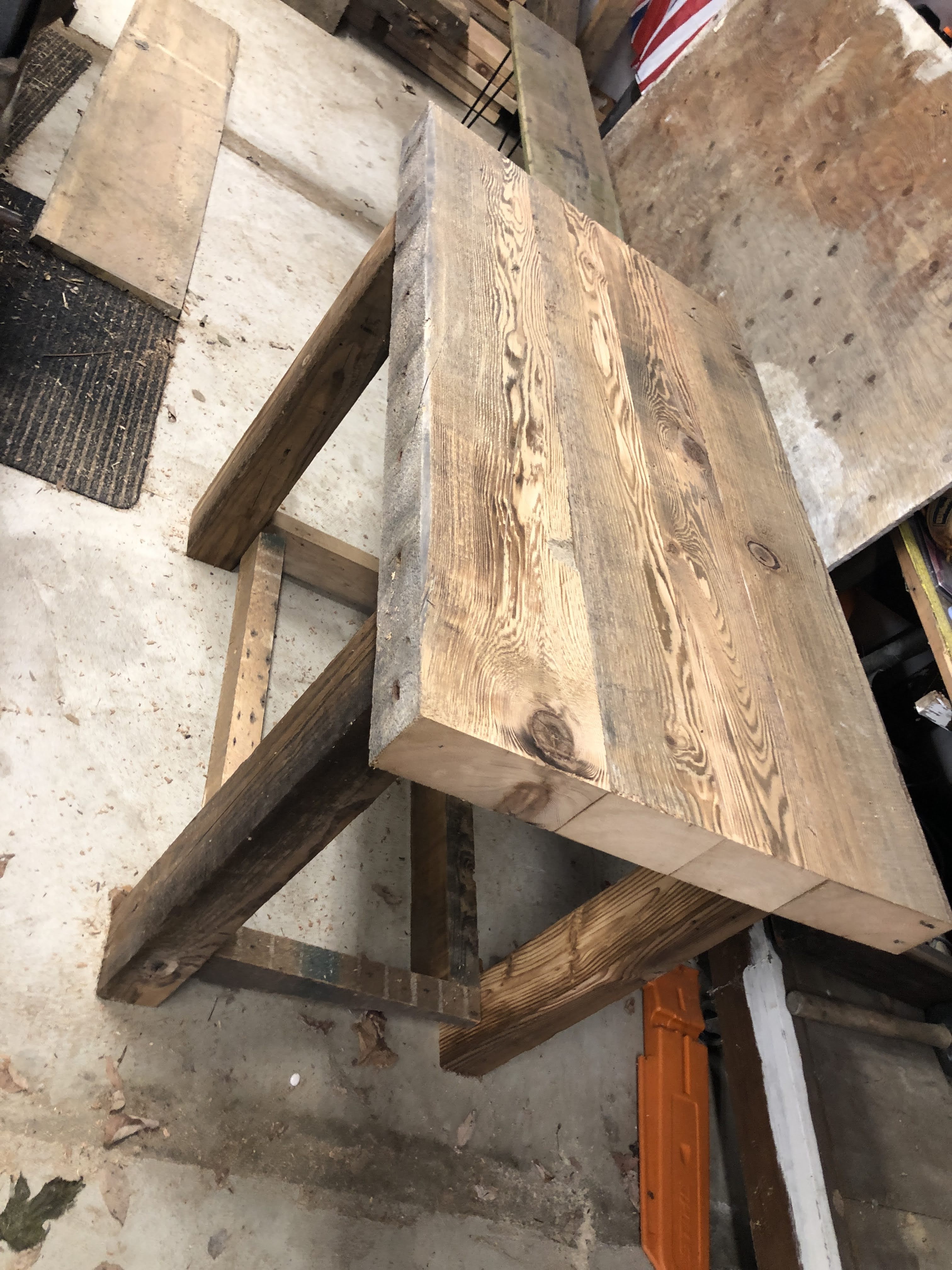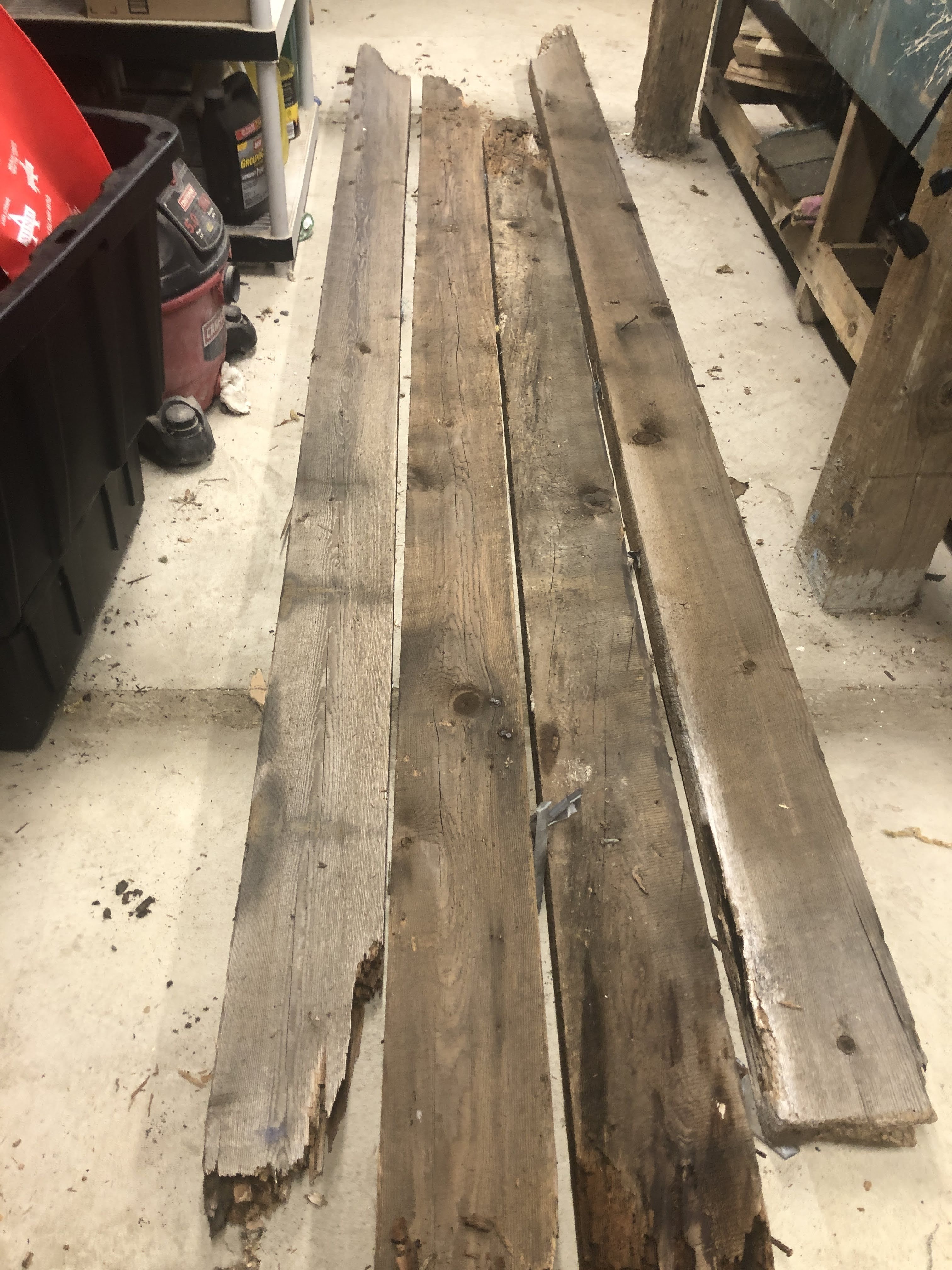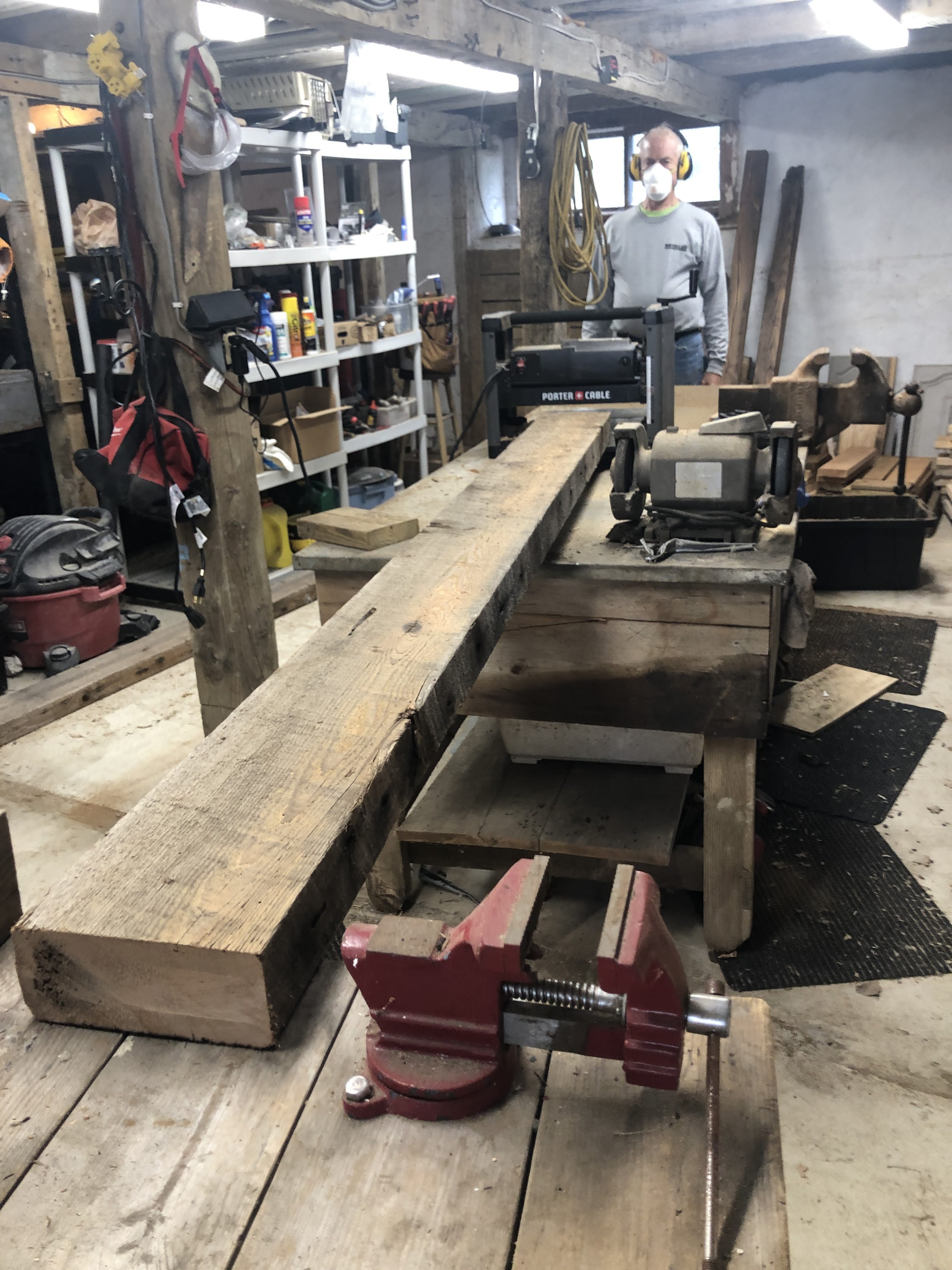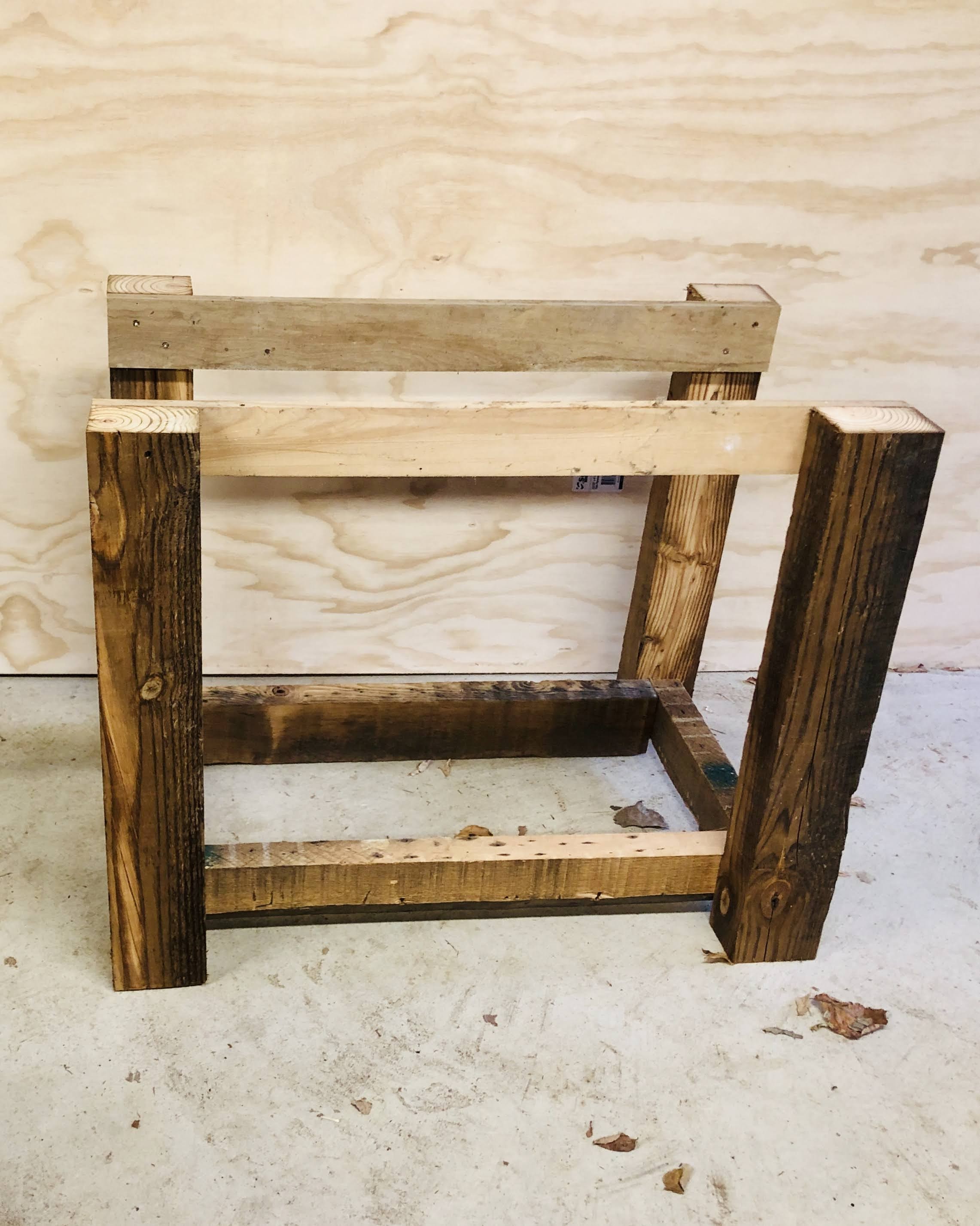 First up the vanity, with gnarly legs made out of the old laundry room rafters and the chunky counter made from the floor joists of the laundry room. The bottom shelf was cut from damaged barn boards discarded after making some siding repairs to the barn last summer. The larger lumber all had 100 year old nails in them so I could tell they were used elsewhere before their most recent job description. I planed them all down for uniform dimensions where needed and cut them to length. The counter top was joined together with a combination of 6″ and 8″ lag bolts. I stained the legs and left the top natural, with a poly finish so it could be cleaned.