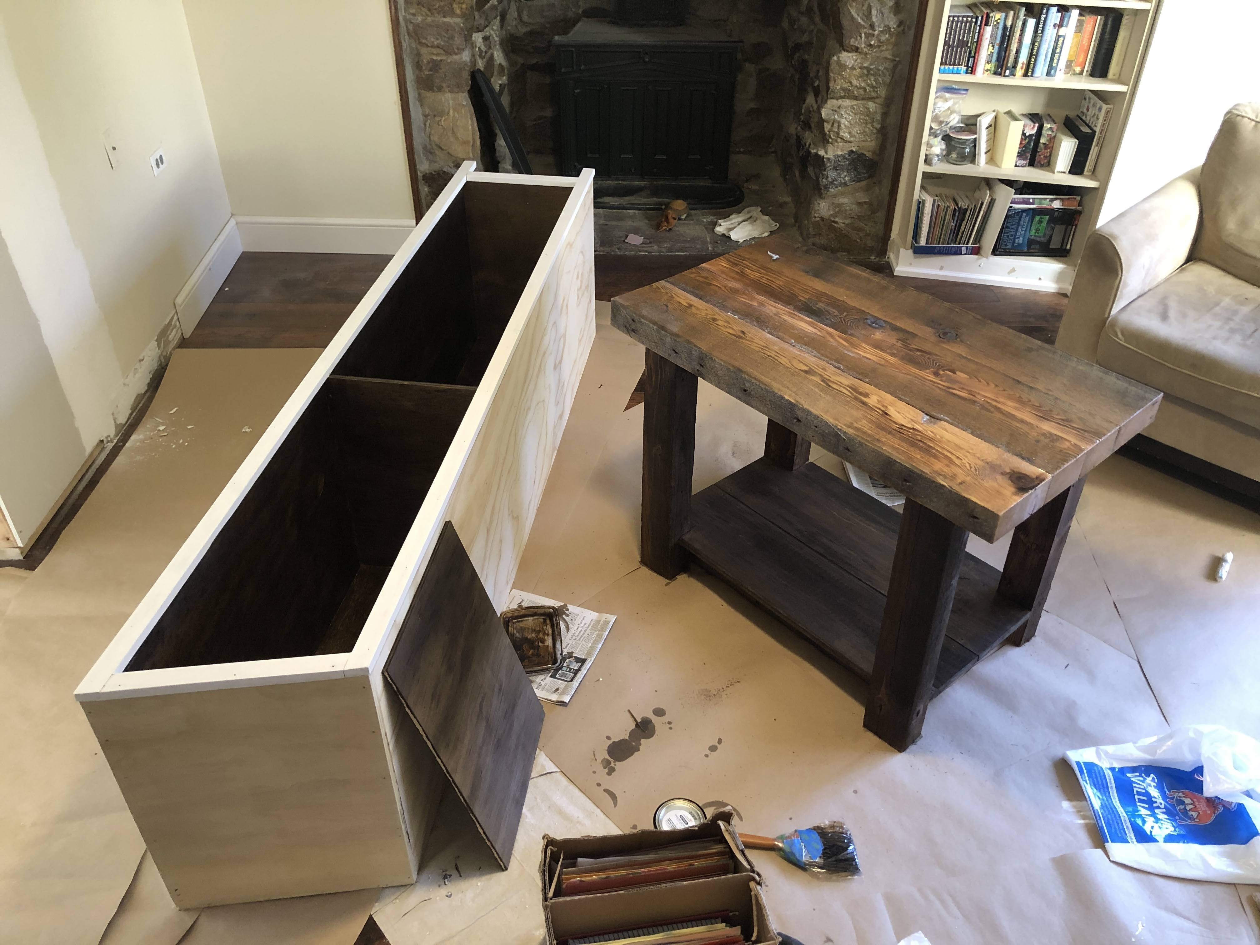 I looked into buying a vanity, but really wanted the bathroom to have a broom closet (the farmhouse doesn’t have a single closet on the first floor, so my vacuum is always sitting out in the open). I had decided on carrying the vaulted ceiling through to the bathroom so just any, old box cabinet would not do. Attempts to buy them from a store fell flat as the prices were outrageous. I got a quote to have them both custom made and it would have been $900 for a vanity with no counter or sink plus another $1000 for the broom closet. Still above my price point.